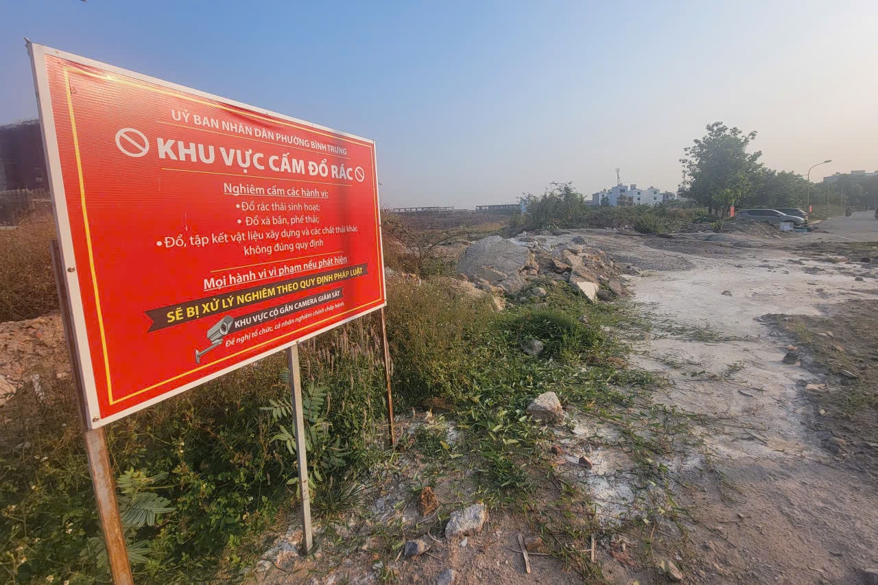 Để ngăn chặn tình trạng đổ rác tự phát, UBND phường Bình Trưng đã dựng nhiều biển cấm tại một số khu vực phát sinh bãi rác tự phát nhưng nhiều nơi vẫn tái diễn. Ảnh: Quang Phương chụp sáng 10/4