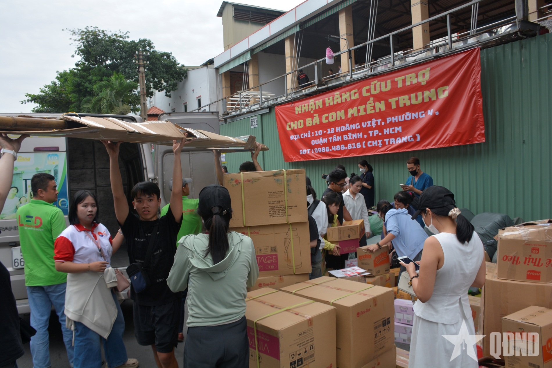 Tại trụ sở Ủy ban Mặt trận Tổ quốc Việt Nam TP Hồ Chí Minh (phường Tân Định), người dân nườm nượp vận chuyển hàng cứu trợ đến đồng bào vùng bão lũ miền Trung. Các tình nguyện viên tại đây đã túc trực xuyên đêm qua để hỗ trợ tiếp nhận, đóng gói hàng hóa cứu trợ. Ngay trong buổi tối, Ủy ban Mặt trận Tổ quốc Việt Nam TP Hồ Chí Minh đã chuyển gấp 15 tấn hàng hóa đến người dân vùng bão lũ.
