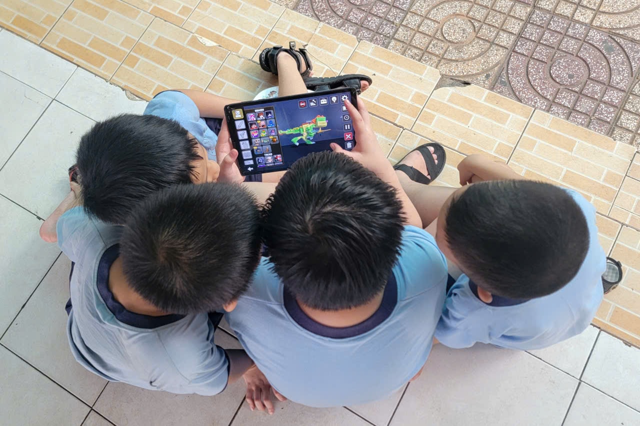 Tình trạng trường học thiếu các khu vực vui chơi, giải trí nên sau giờ học, nhiều học sinh tụm lại để sử dụng máy tính bảng chơi game. Ảnh: Quang Phương chụp tại một trường học trên địa bàn phường Tăng Nhơn Phú