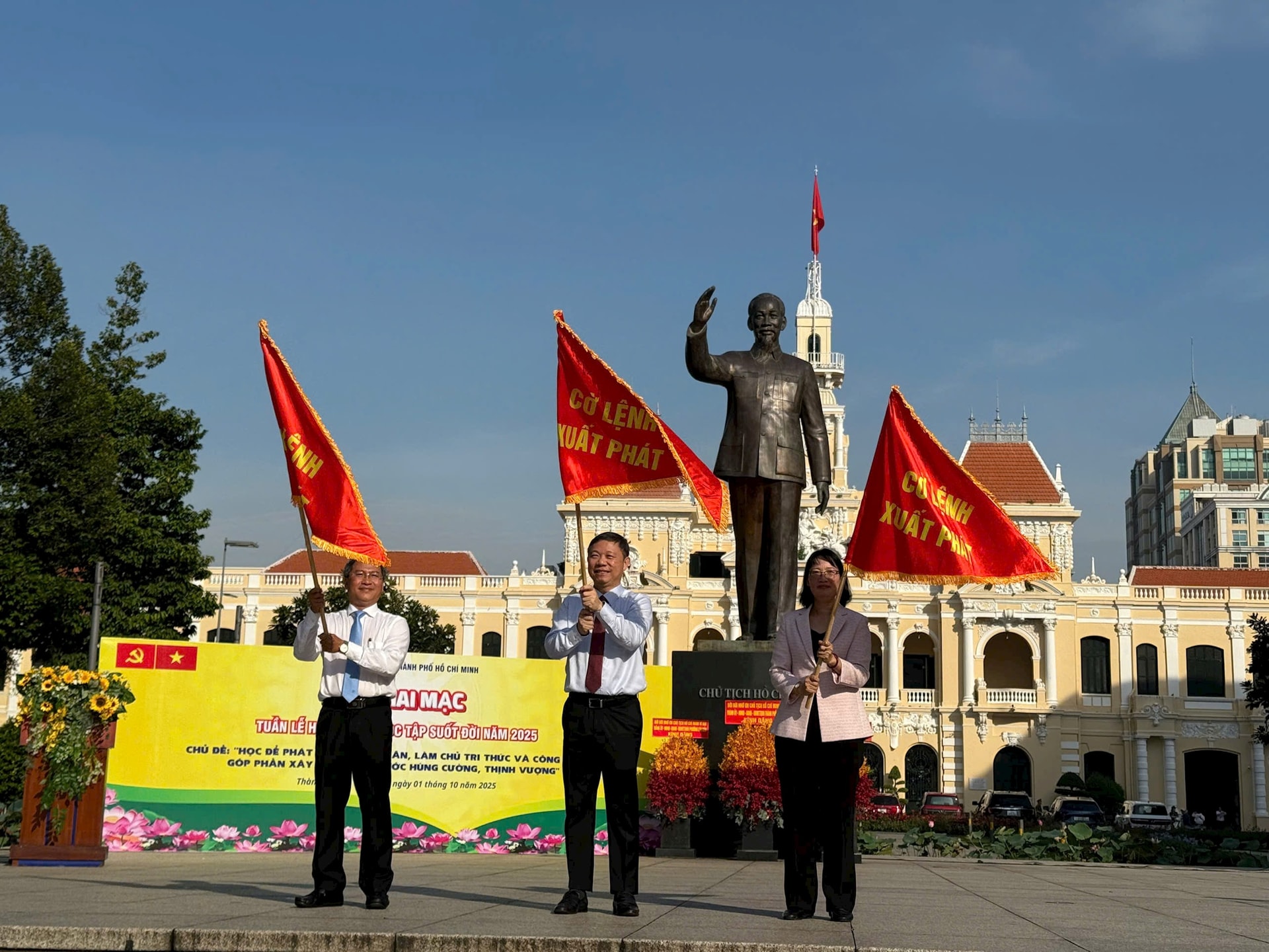 Lãnh đạo thành phố Hồ Chí Minh và phường Sài Gòn cùng phất cờ khai mạc Tuần lễ hưởng ứng học tập suốt đời năm 2025. Ảnh: Nghiêm Ý