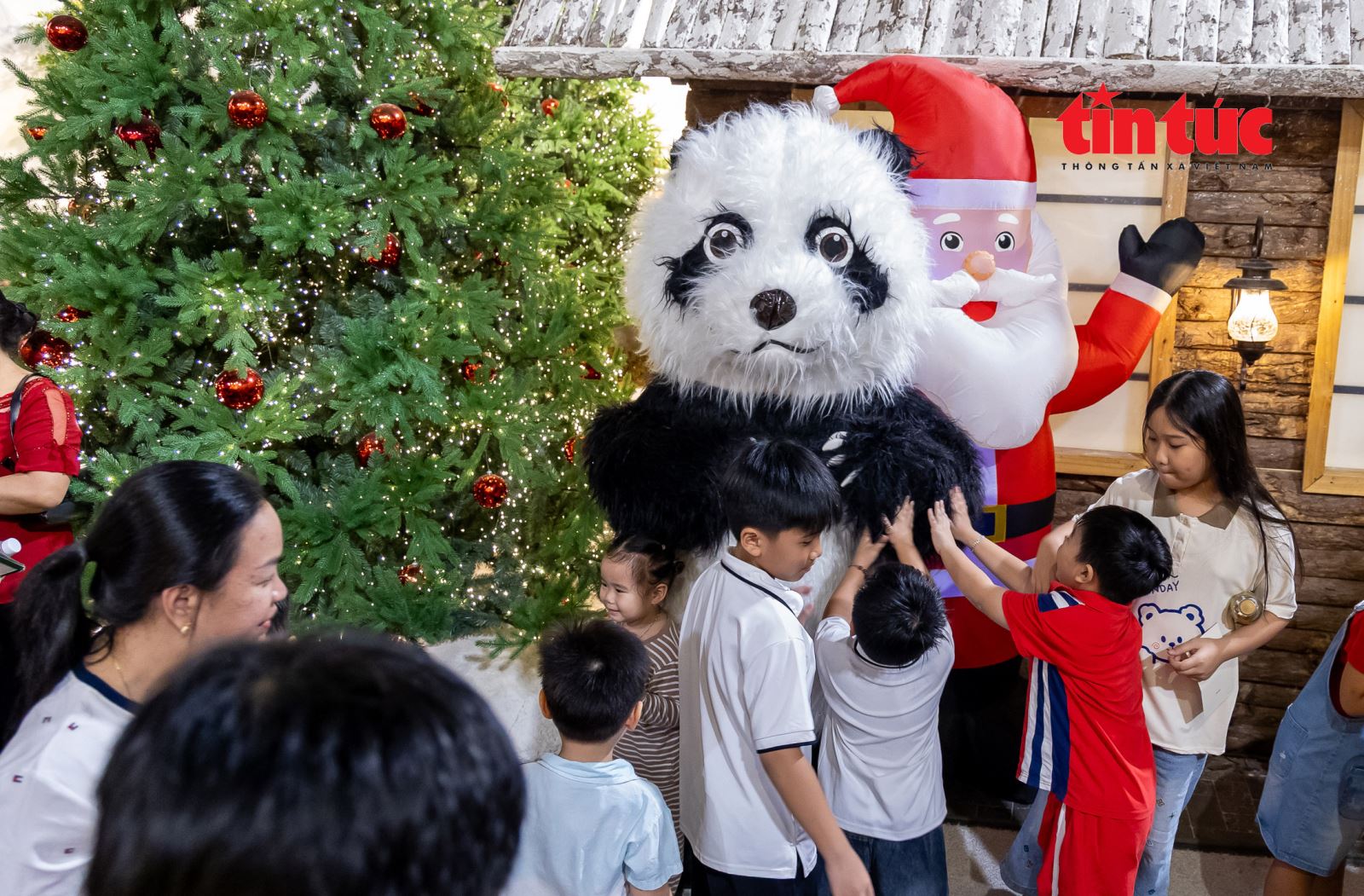 Các em nhỏ thích thú với mô hình gấu trúc và ông già Noel.