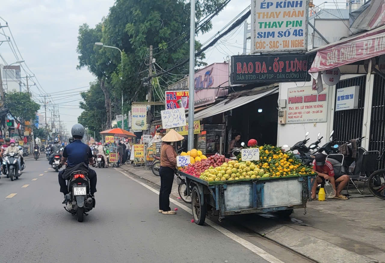 Xe hàng rong buôn bán lấn chiếm lòng, lề đường trên đường Phạm Hữu Lầu, phường Tân Mỹ, TP. Hồ Chí Minh. Ảnh: Quang Phương