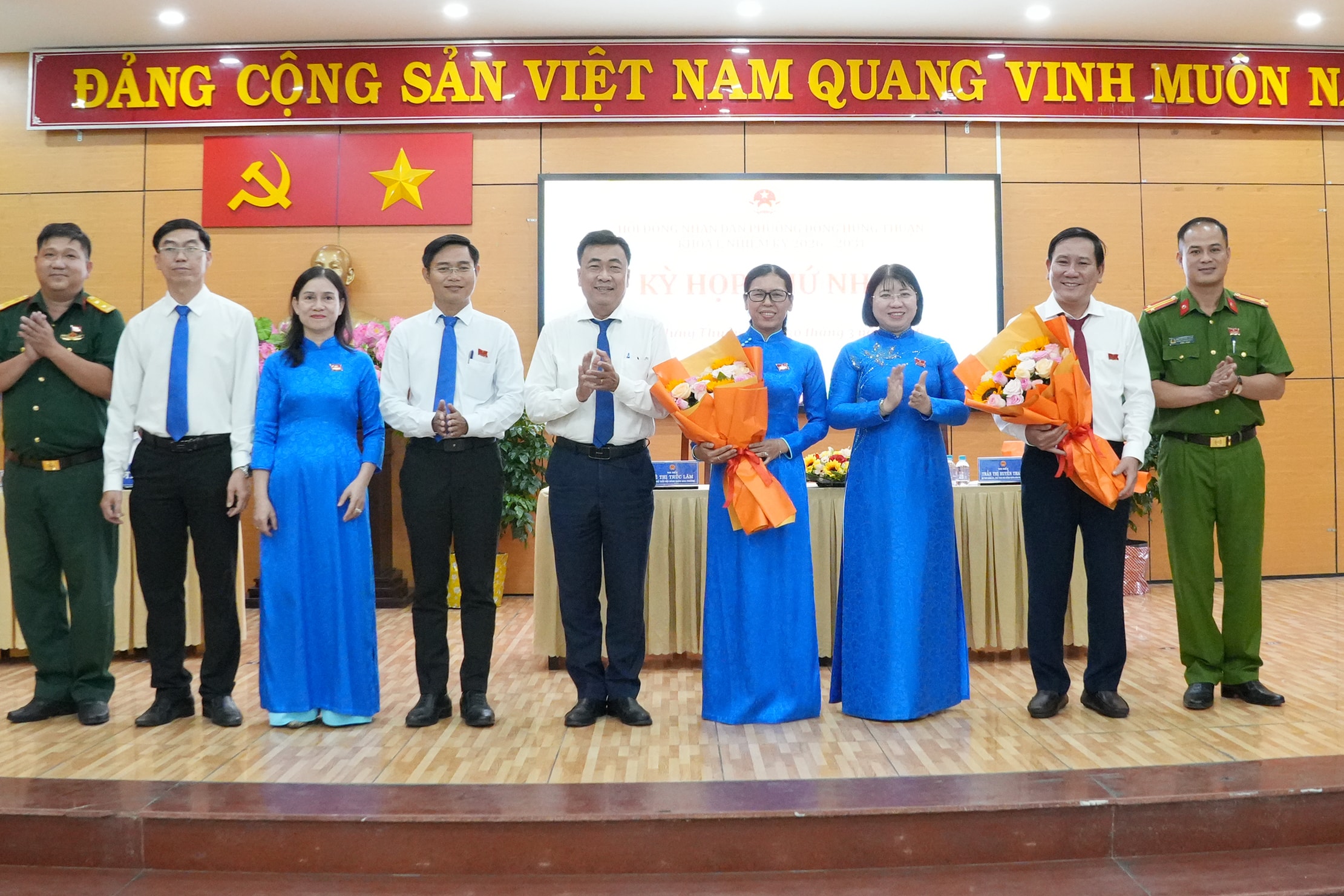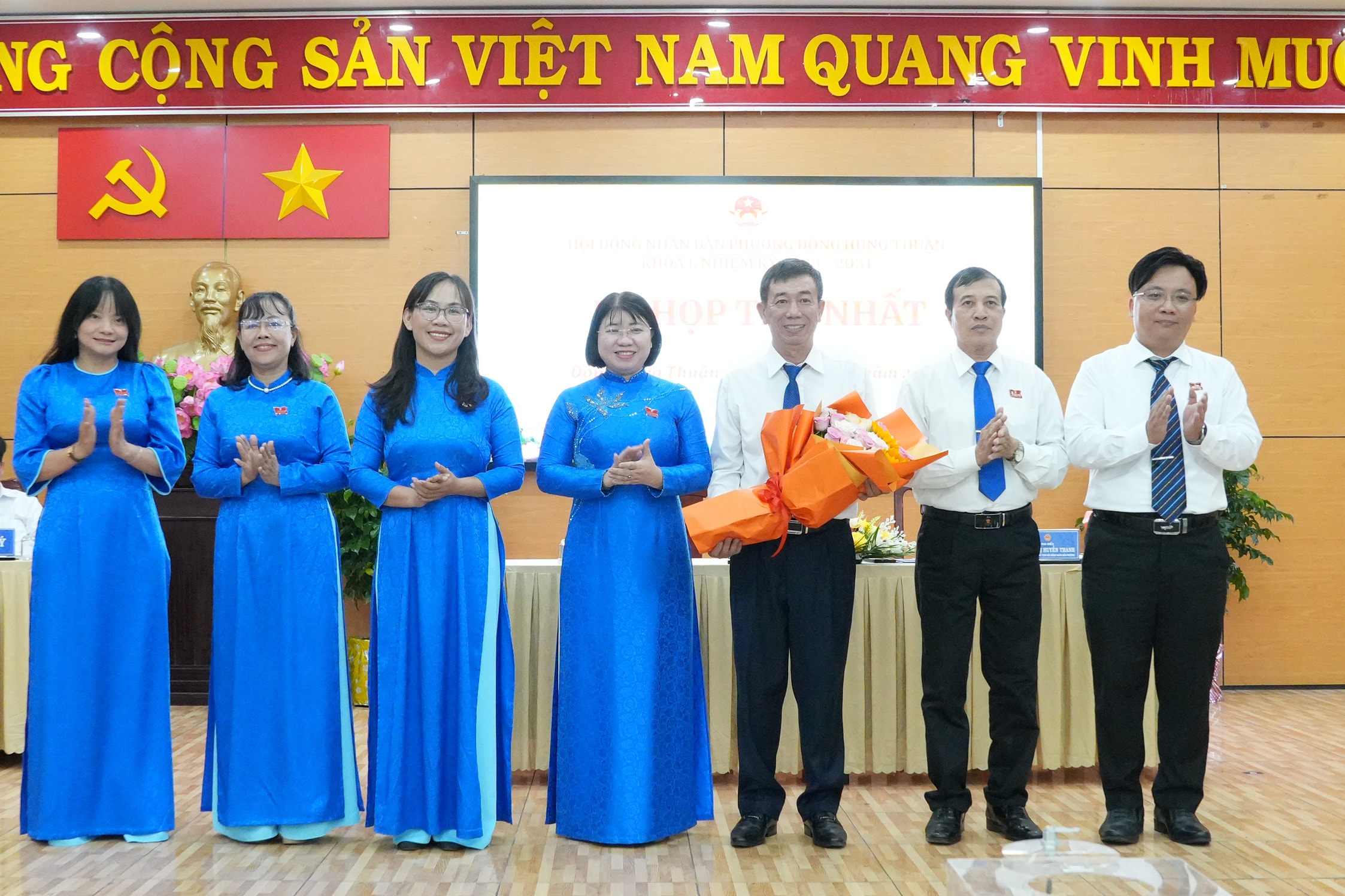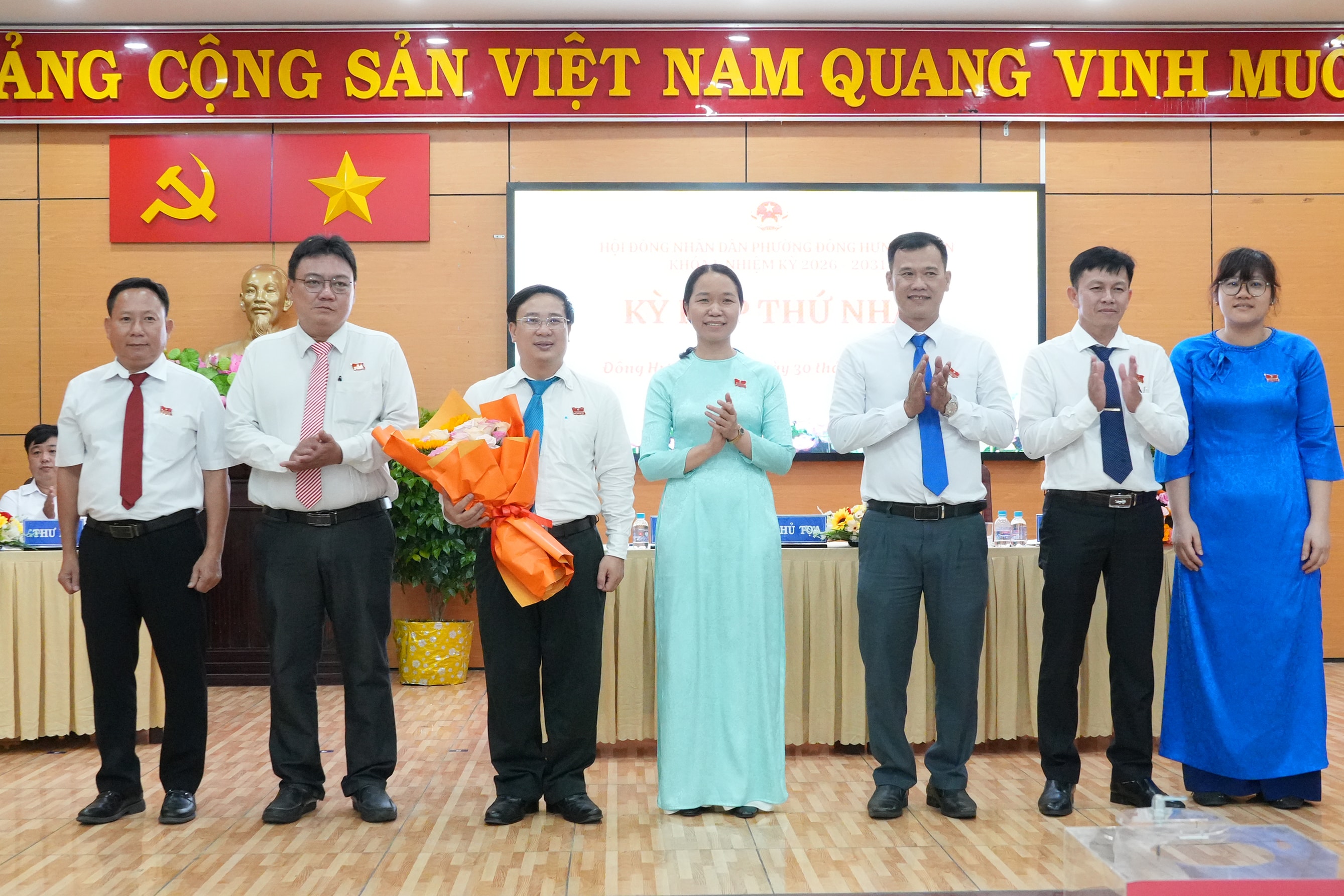 Thường trực Đảng ủy tặng hoa chúc mừng lãnh đạo HĐND phường Đông Hưng Thuận nhiệm kỳ 2026 – 2031