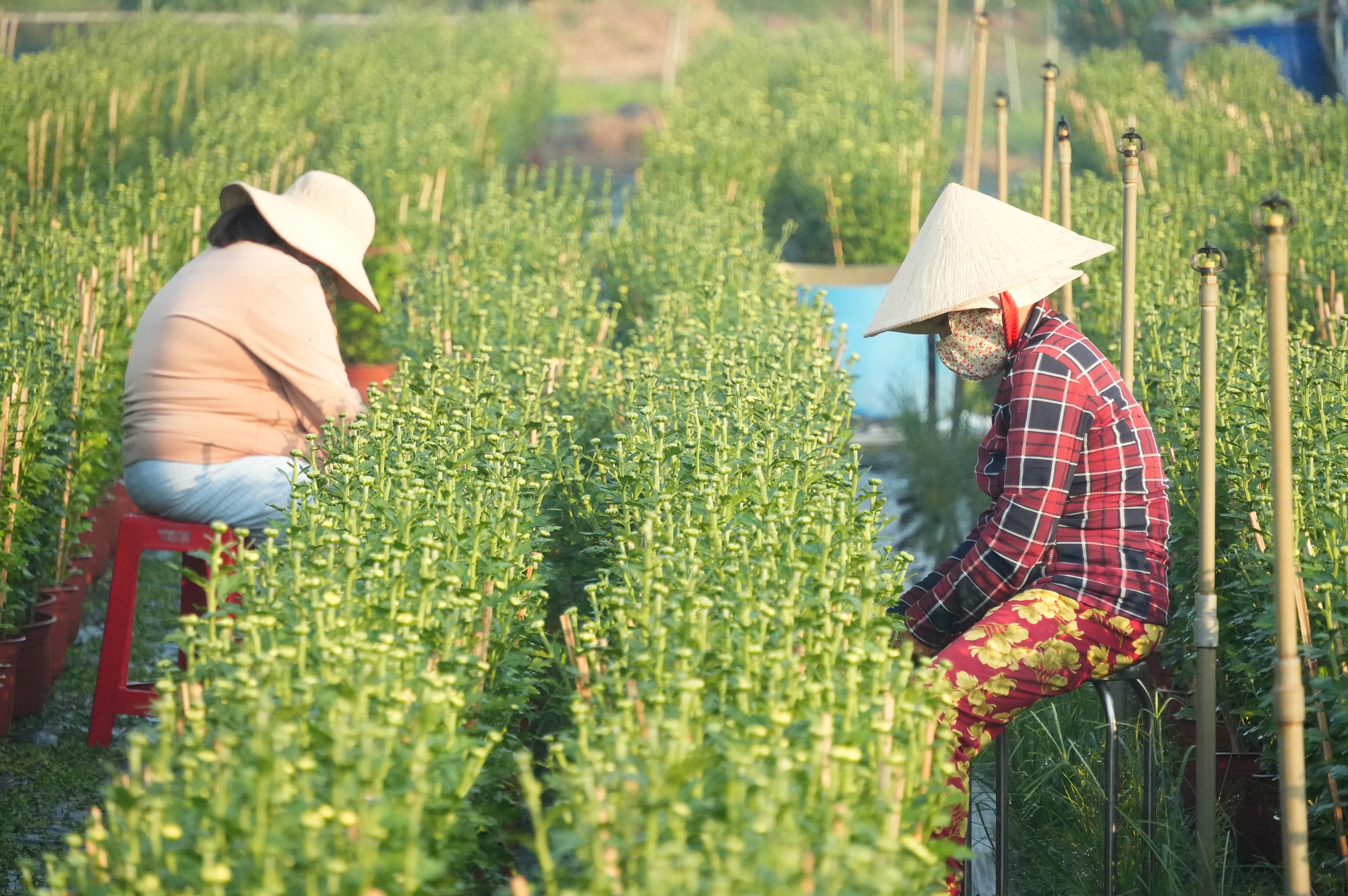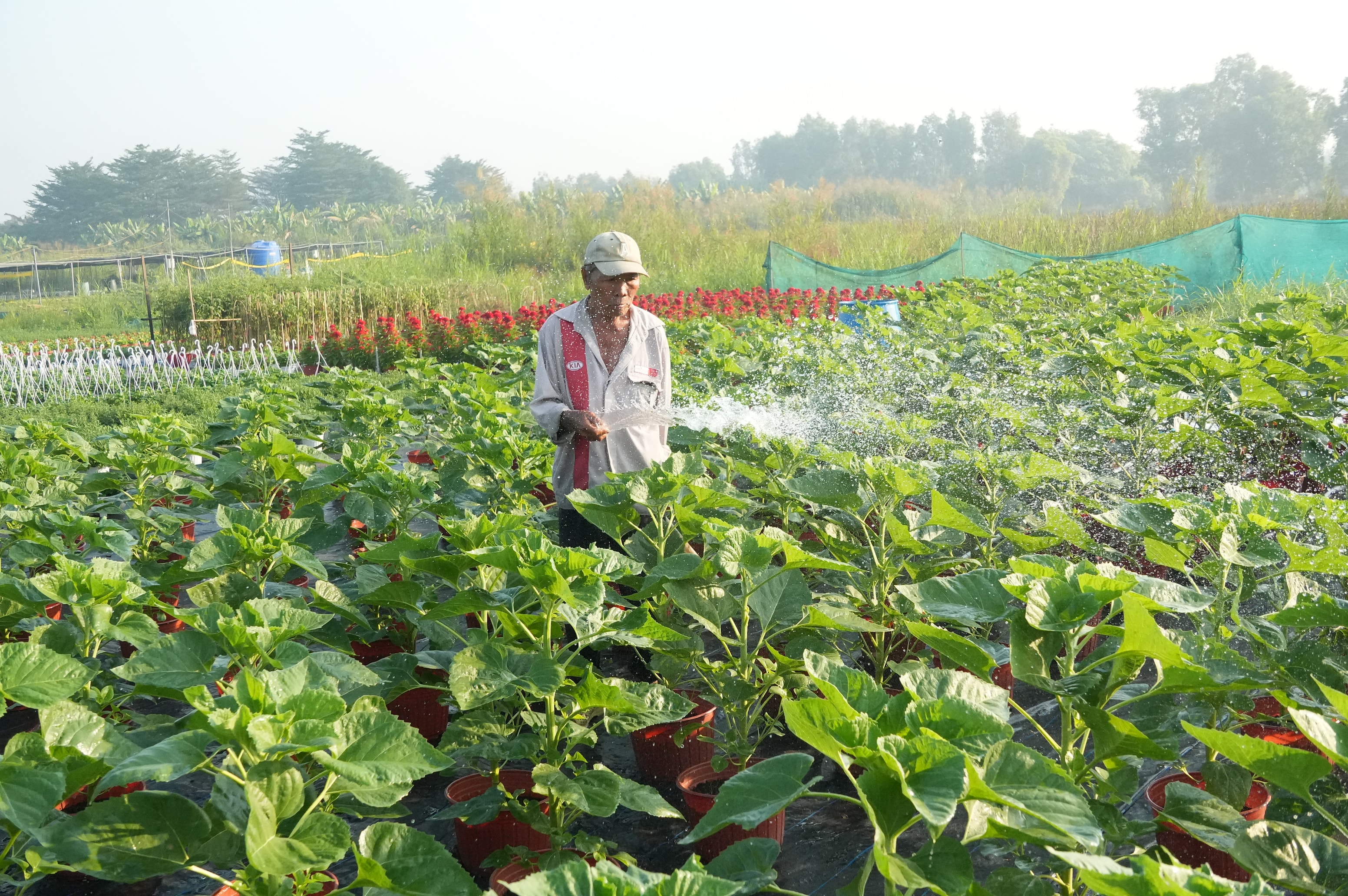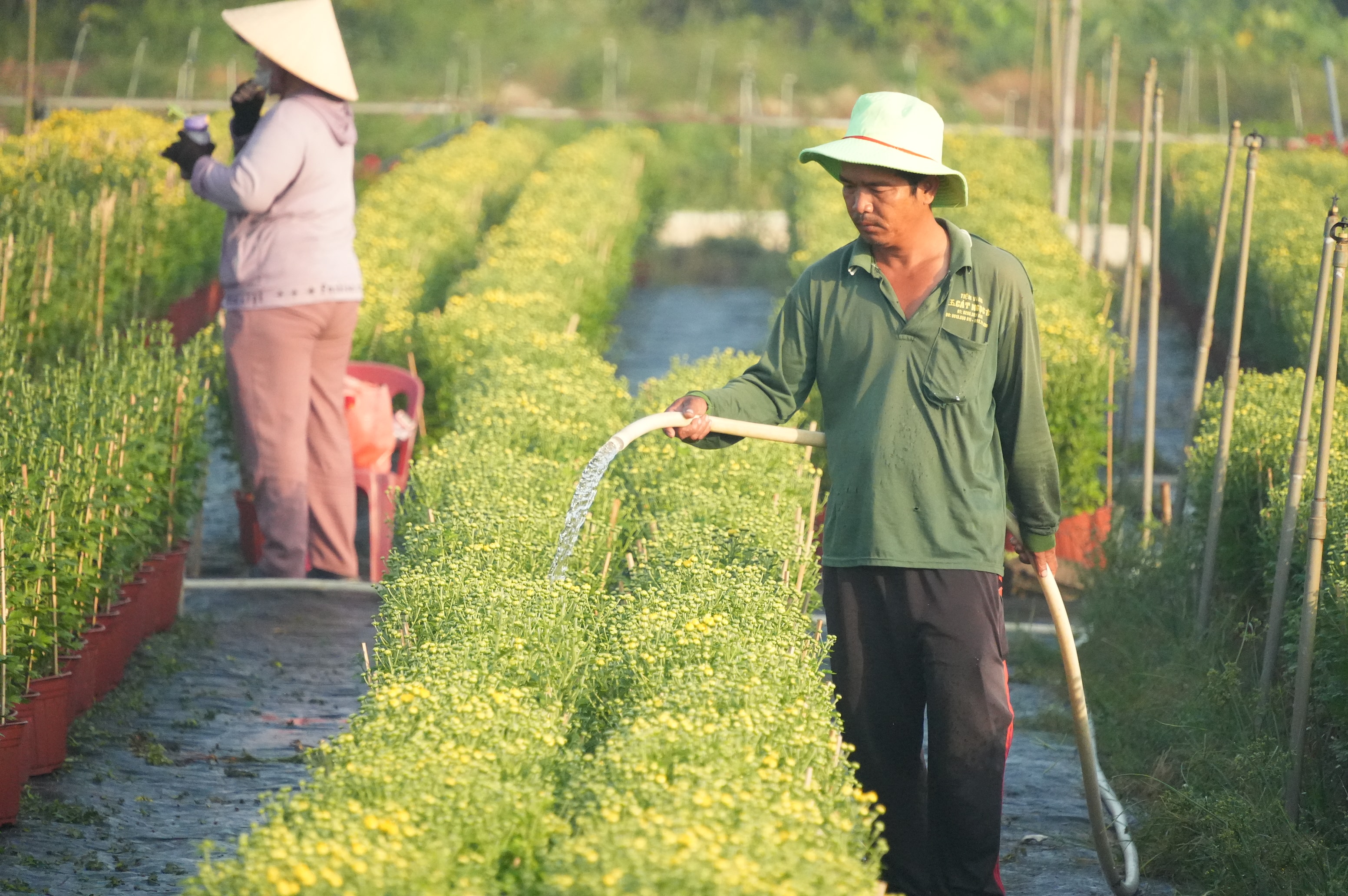 Từ sáng sớm người dân đã có mặt tại vườn để chăm sóc hoa để kịp tiến độ mùa vụ tết