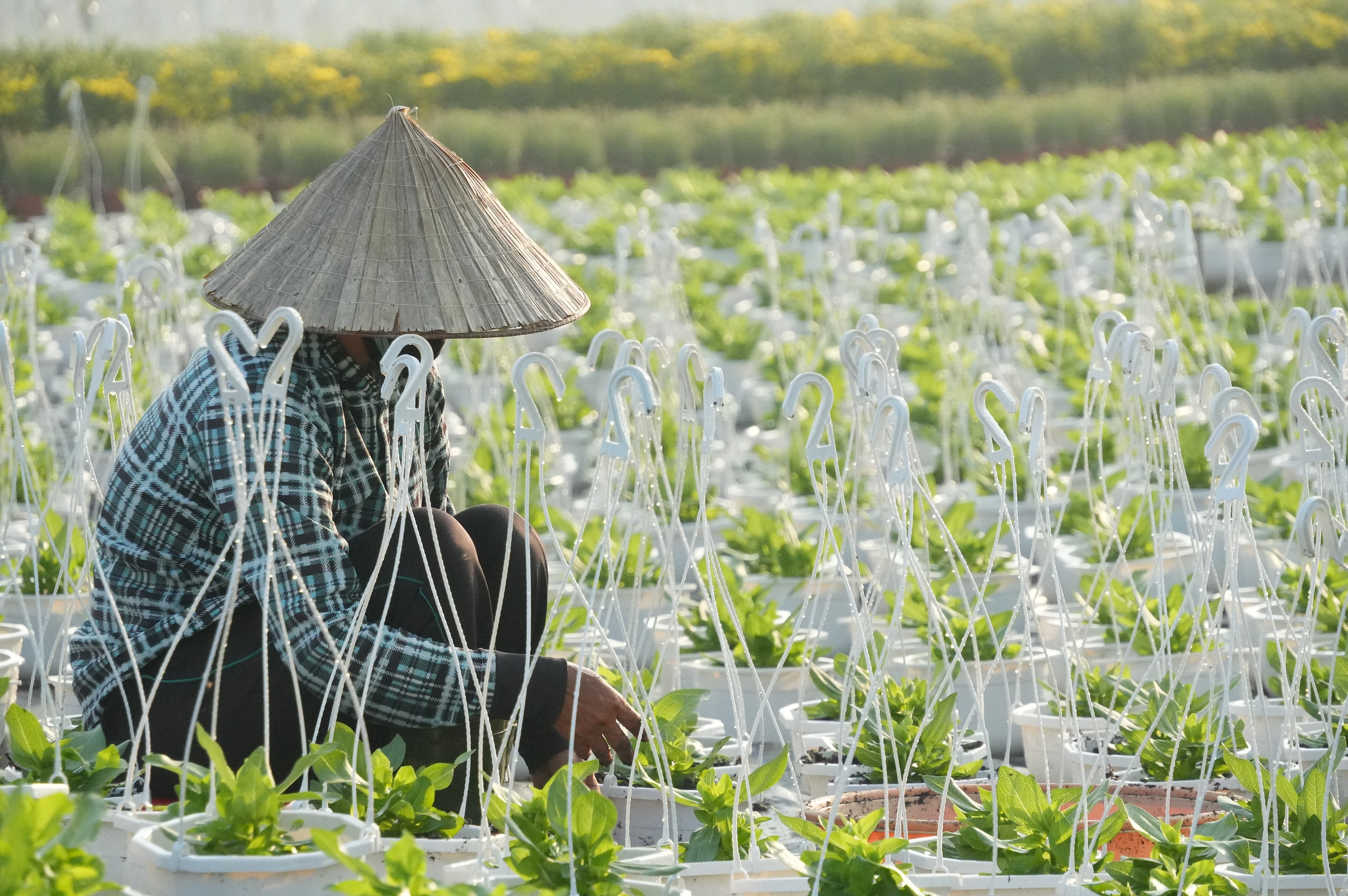 Tại khu đất ven sông Vàm Thuật, những mảnh vườn xanh mướt trải dài, hàng ngàn chậu hoa được xếp ngay ngắn, tạo nên khung cảnh đặc trưng của làng hoa mỗi dịp cuối năm. Người trồng hoa tất bật chăm sóc từng chậu cây, tính toán kỹ lưỡng thời gian sinh trưởng, ra hoa để hoa nở rộ đúng dịp Tết, đảm bảo chất lượng khi đưa ra thị trường.