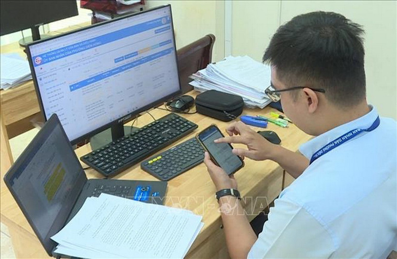 Công chức cấp xã tại Thành phố Hồ Chí Minh đã hoàn toàn quen với việc tiếp nhận và xử lý công việc trên laptop, điện thoại hoặc máy tính bảng. (Ảnh: TTXVN phát)