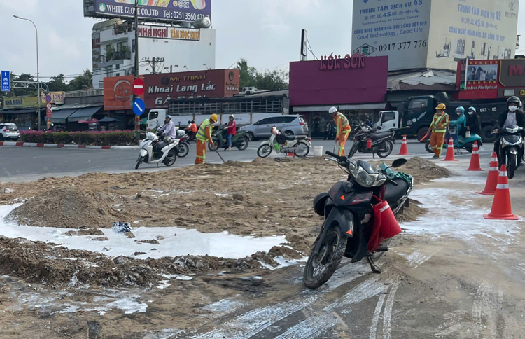 Đến khoảng 5 giờ, lực lượng Cảnh sát giao thông cùng các đơn vị liên quan có mặt, tổ chức phân luồng, xử lý hiện trường. Công nhân được huy động rải cát để thấm sơn, làm sạch mặt đường, tránh trơn trượt gây nguy hiểm cho người tham gia giao thông.