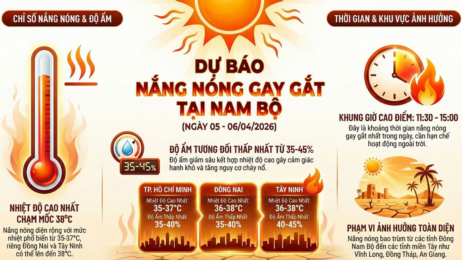 Bên cạnh nhiệt độ cao, độ ẩm tương đối thấp nhất chỉ dao động từ 35 - 40% khiến không khí trở nên hanh khô rõ rệt. Thời gian nắng nóng cao điểm trong ngày sẽ kéo dài từ 12 giờ đến 15 giờ, do đó người dân cần chủ động các biện pháp phòng chống sốc nhiệt và hạn chế làm việc trực tiếp dưới ánh nắng mặt trời để bảo vệ sức khỏe.