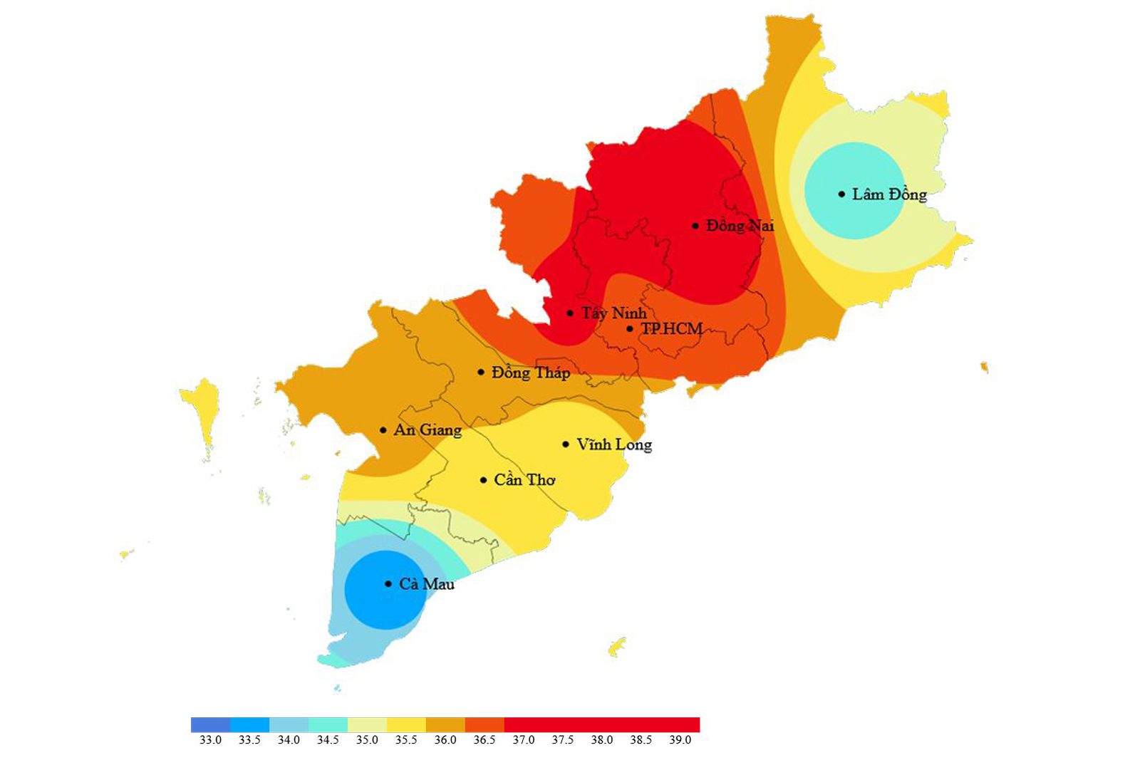 Trong khi đó, các tỉnh miền Đông nắng nóng mở rộng trở lại với nhiệt độ cao nhất một số nơi như: Biên hòa 36,1 độ C; Tây Ninh và Phước Long 36 độ C, Trị An và Đồng Xoài 35,8 độ C. Miền Tây có nơi nắng nóng như Châu Đốc 35,5 độ C; Cao Lãnh 35 độ C. Độ ẩm tương đối thấp nhất dao động từ 34 - 54 %, thấp nhất là Đồng Xoài 34 %.