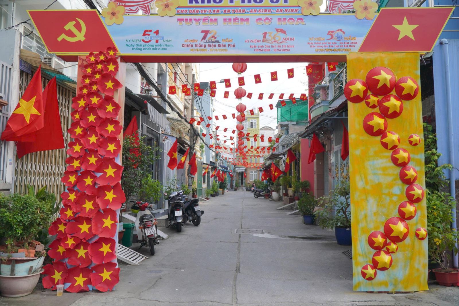 Các tuyến hẻm được trang trí đồng bộ, rực rỡ cờ hoa chào mừng kỷ niệm ngày thống nhất đất nước.