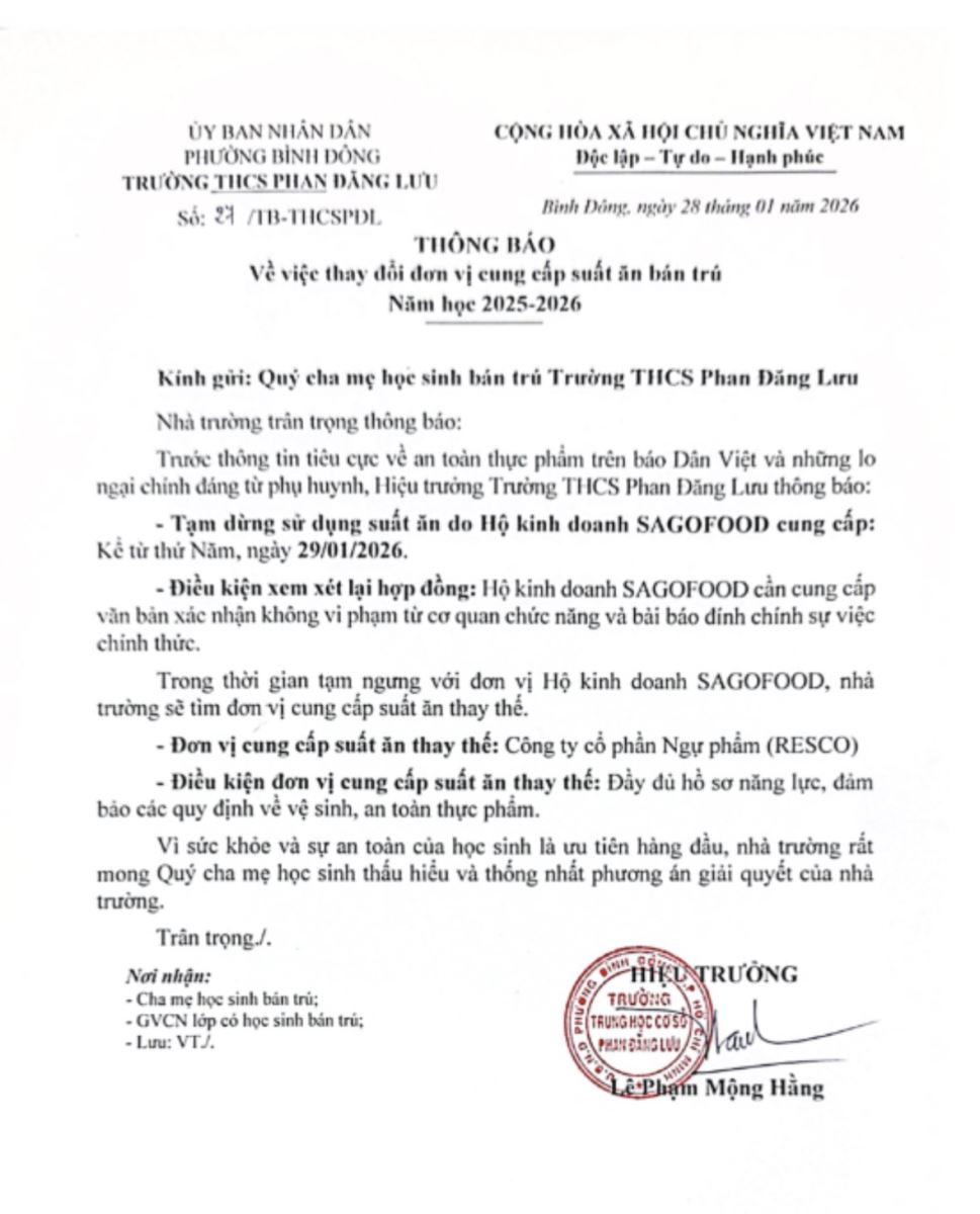 Thông báo của trường THCS Phan Đăng Lưu (phường Bình Đông) về việc đổi đơn vị cung cấp suất ăn bán trú.