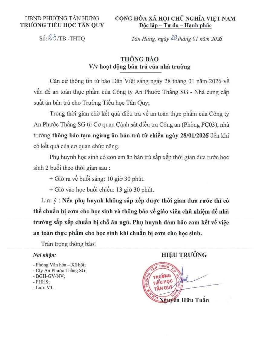 Trường Tiểu học Tân Quy cũng thông báo tạm dừng cung cấp suất ăn bán trú từ chiều 28/1, trong khi chờ kết quả kiểm tra của cơ quan chức năng đối với nhà cung cấp dịch vụ suất ăn.