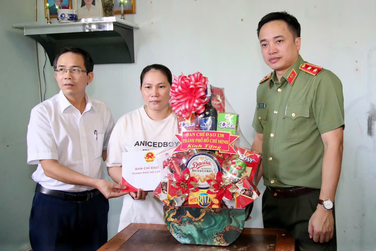Trung tướng Mai Hoàng, Giám đốc Công an thành phố Hồ Chí Minh thăm hỏi, động viên bà Hoàng Thị Bích Vân, thuộc diện gia đình có hoàn cảnh khó khăn tại phường Bà Rịa. Ảnh Công an cung cấp.