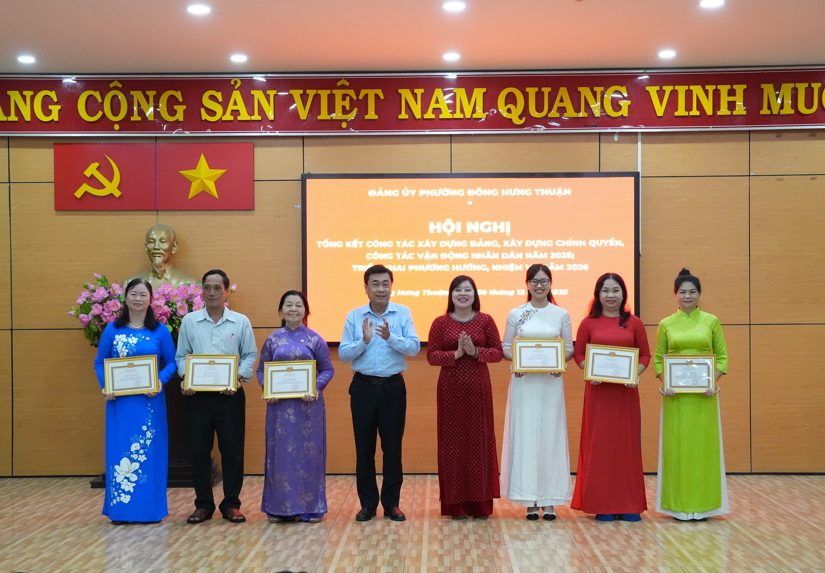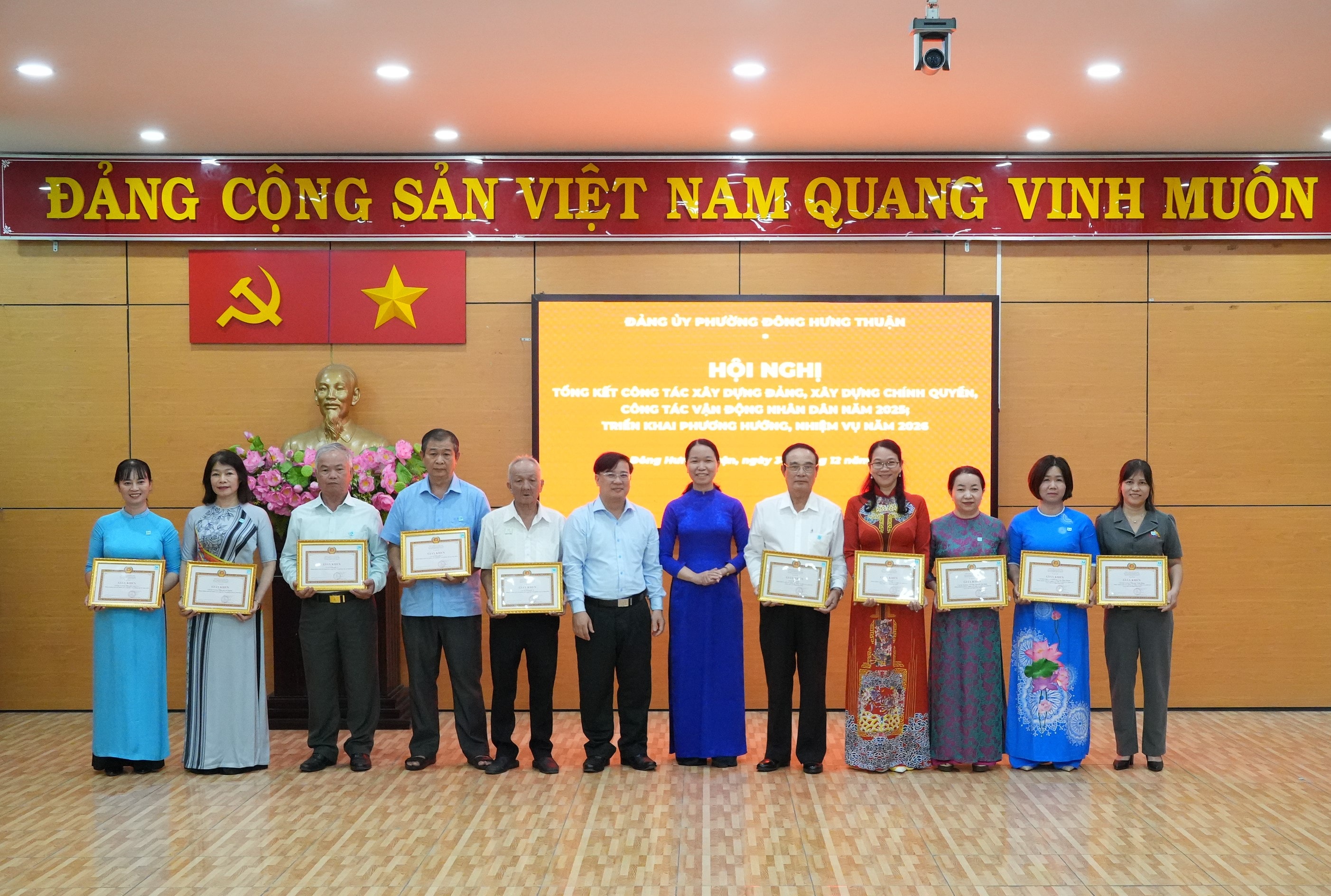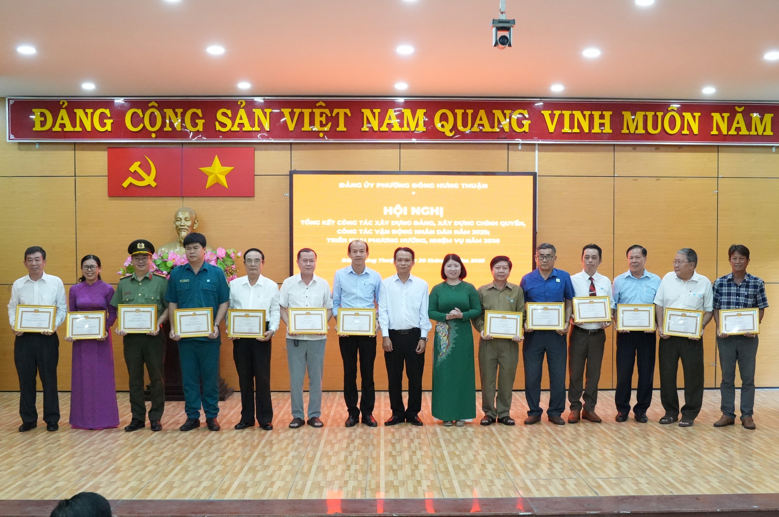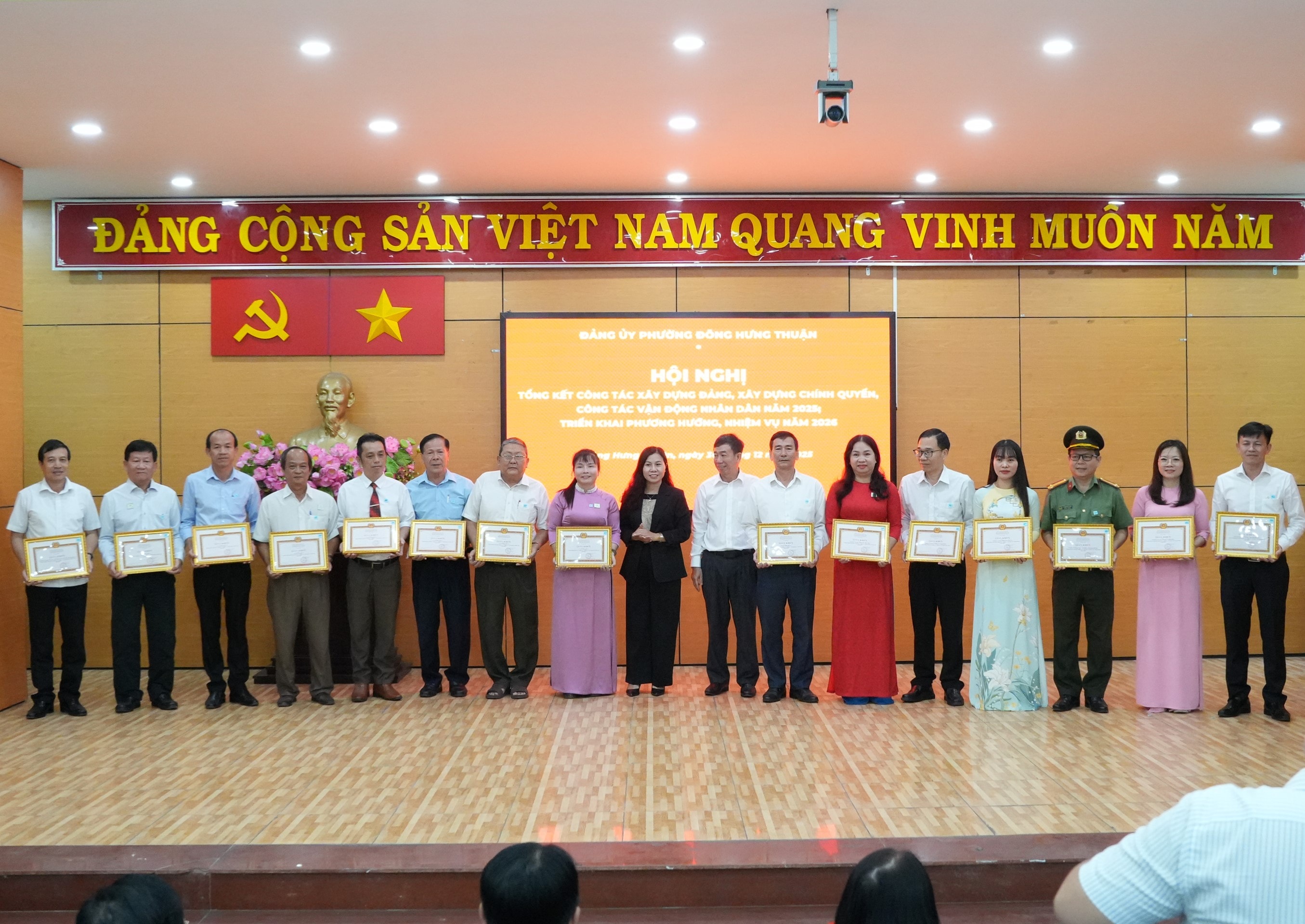 Tại hội nghị, Đảng ủy phường Đông Hưng Thuận đã khen thưởng các tập thể, cá nhân tiêu biểu có thành tích xuất sắc trong công tác xây dựng Đảng, xây dựng chính quyền, vận động Nhân dân năm 2025 và đợt thi đua cao điểm 100 ngày “Tinh gọn – mạnh – hiệu năng, hiệu lực, hiệu quả”.