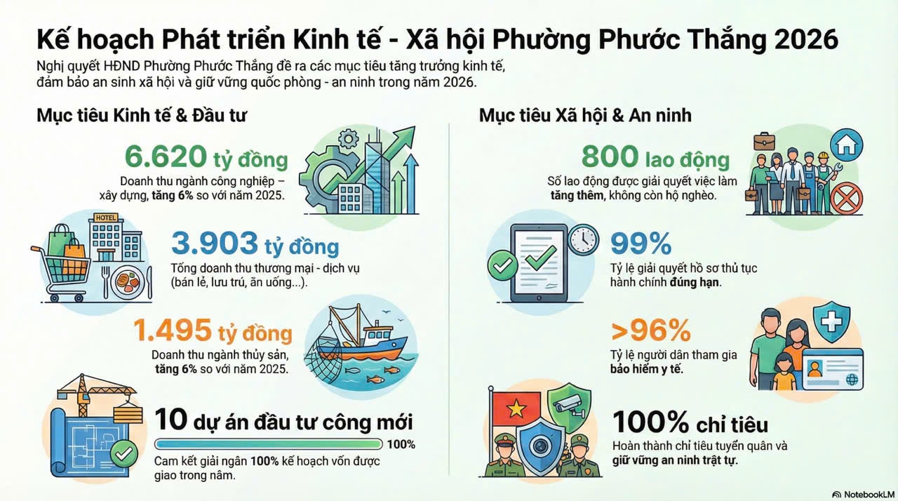 Với hệ thống mục tiêu rõ ràng, chỉ tiêu cụ thể và các nhóm giải pháp đồng bộ, phường Phước Thắng thể hiện quyết tâm chính trị cao trong việc nâng cao hiệu lực quản lý nhà nước, phát huy vai trò của chính quyền cơ sở, tạo sự đồng thuận trong Nhân dân, qua đó góp phần thực hiện thắng lợi các mục tiêu phát triển kinh tế – xã hội, quốc phòng – an ninh trong năm 2026 và những năm tiếp theo.