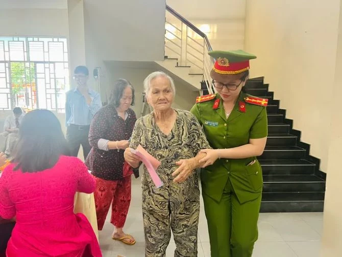 Cụ bà ở xã Long Điền bị đau chân vẫn cố gắng đi bỏ phiếu.