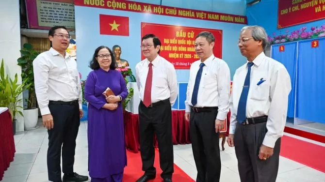 Chủ tịch Quốc hội Trần Thanh Mẫn và Bí thư Thành ủy TP Hồ Chí Minh Trần Lưu Quang đến dự lễ khai mạc và bỏ phiếu bầu ĐBQH khóa XVI và đại biểu HĐND các cấp nhiệm kỳ 2026 - 2031 tại khu vực bỏ phiếu số 14 (Trường THCS Đỗ Văn Dậy, xã Hóc Môn, TP Hồ Chí Minh).