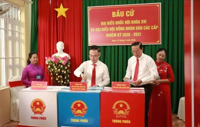 Các đồng chí tạilễ khai mạc và bỏ phiếu bầu ĐBQH khóa XVI và đại biểu HĐND các cấp nhiệm kỳ 2026 - 2031 tại khu vực bỏ phiếu số 14 (Trường THCS Đỗ Văn Dậy, xã Hóc Môn, TP Hồ Chí Minh).
