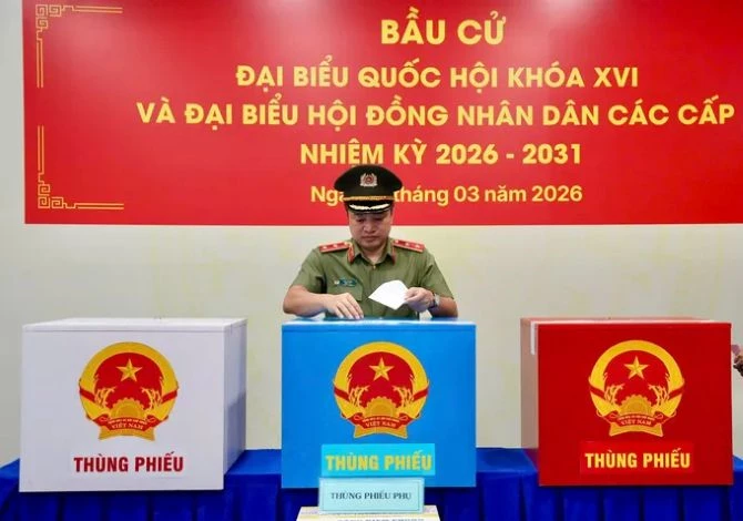 Trung tướng Mai Hoàng, Giám đốc Công an TP Hồ Chí Minh. bỏ phiếu bầu ĐBQH khóa XVI và ĐB HĐND các cấp nhiệm kỳ 2026-2031 tại điểm bầu cử phường Cầu Ông Lãnh (TP Hồ Chí Minh).