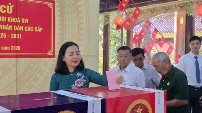 Phó Chủ tịch Thường trực Ủy ban MTTQ Việt Nam TP Hồ Chí Minh Trương Thị Bích Hạnh tham dự lễ khai mạc và bỏ biếu bầu cử ĐBQH khóa XVI và ĐB HĐND các cấp nhiệm kỳ 2026 - 2031 tại khu vực bỏ phiếu số 1 ở phường Dĩ An.