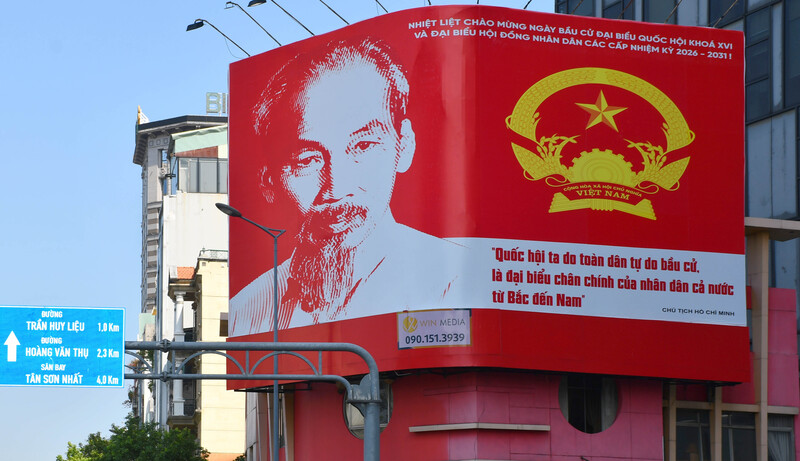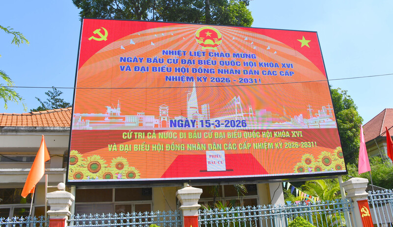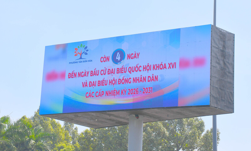 Các bảng điện tử và màn hình lớn trên nhiều tuyến đường tại TP. Hồ Chí Minh trình chiếu thông điệp cổ động, hướng tới ngày bầu cử đại biểu Quốc hội khóa XVI và đại biểu HĐND các cấp nhiệm kỳ 2026 - 2031. Ảnh: Thanh Minh.