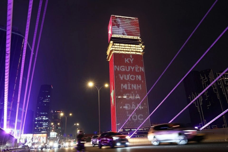 Các tòa nhà cao tầng trung tâm TP. Hồ Chí Minh rực sắc đỏ chào mừng Đại hội XIV.