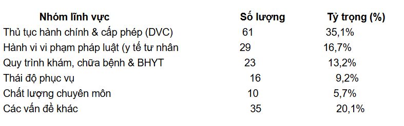 Đặc biệt, hệ thống ghi nhận 29 phản ánh (chiếm 16,7%) về việc “vẽ bệnh, moi tiền” và các vi phạm pháp luật khác liên quan đến hoạt động của các phòng khám tư nhân và cơ sở thẩm mỹ. Một số ý kiến phản ánh tình trạng vi phạm có tính chất lặp lại, phương thức hoạt động ngày càng tinh vi, tiềm ẩn nguy cơ ảnh hưởng đến quyền lợi, sức khỏe và an toàn của người dân.