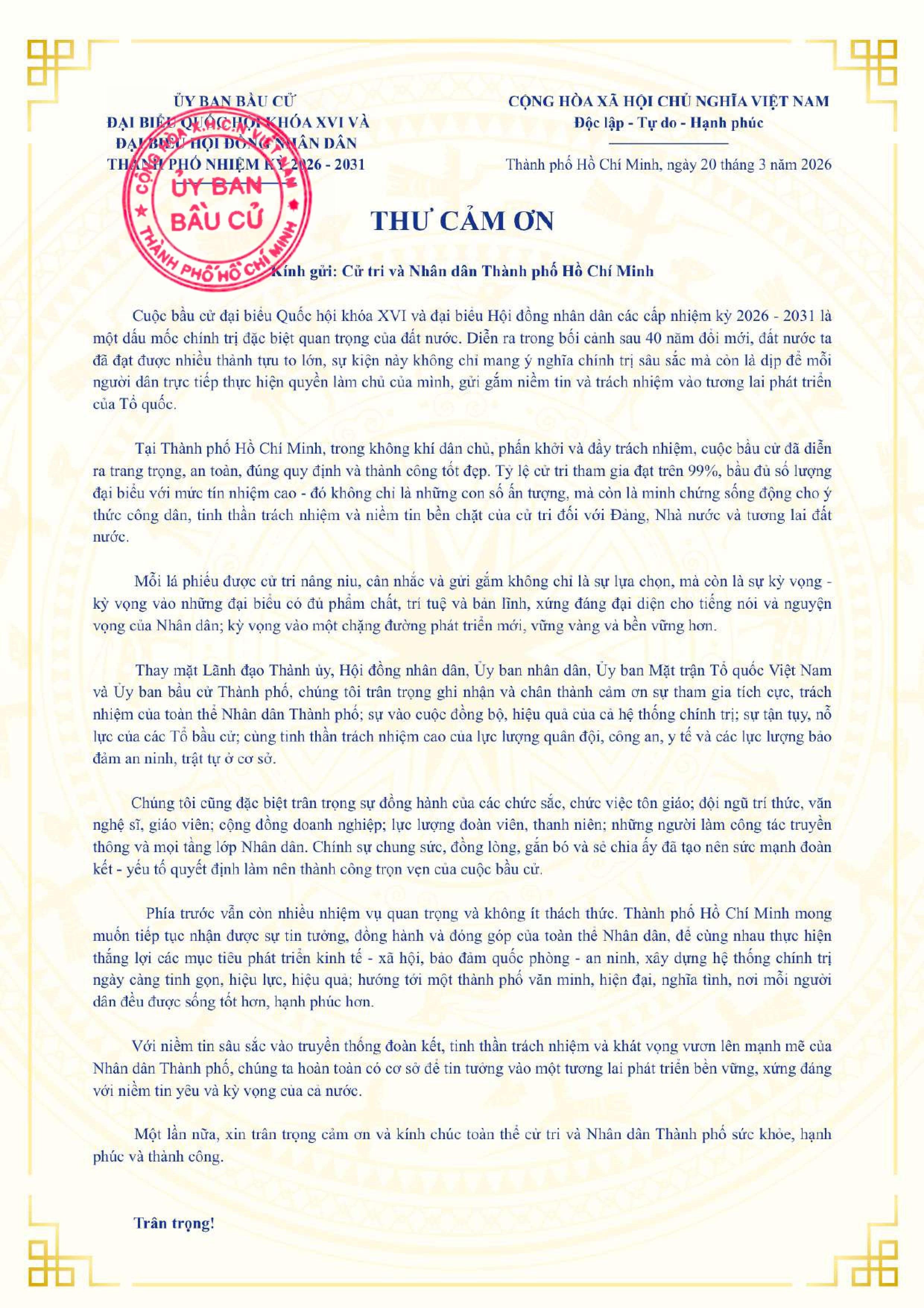 Thư cảm ơn Cử tri và Nhân dân của Ủy ban Bầu cử TP. Hồ Chí Minh