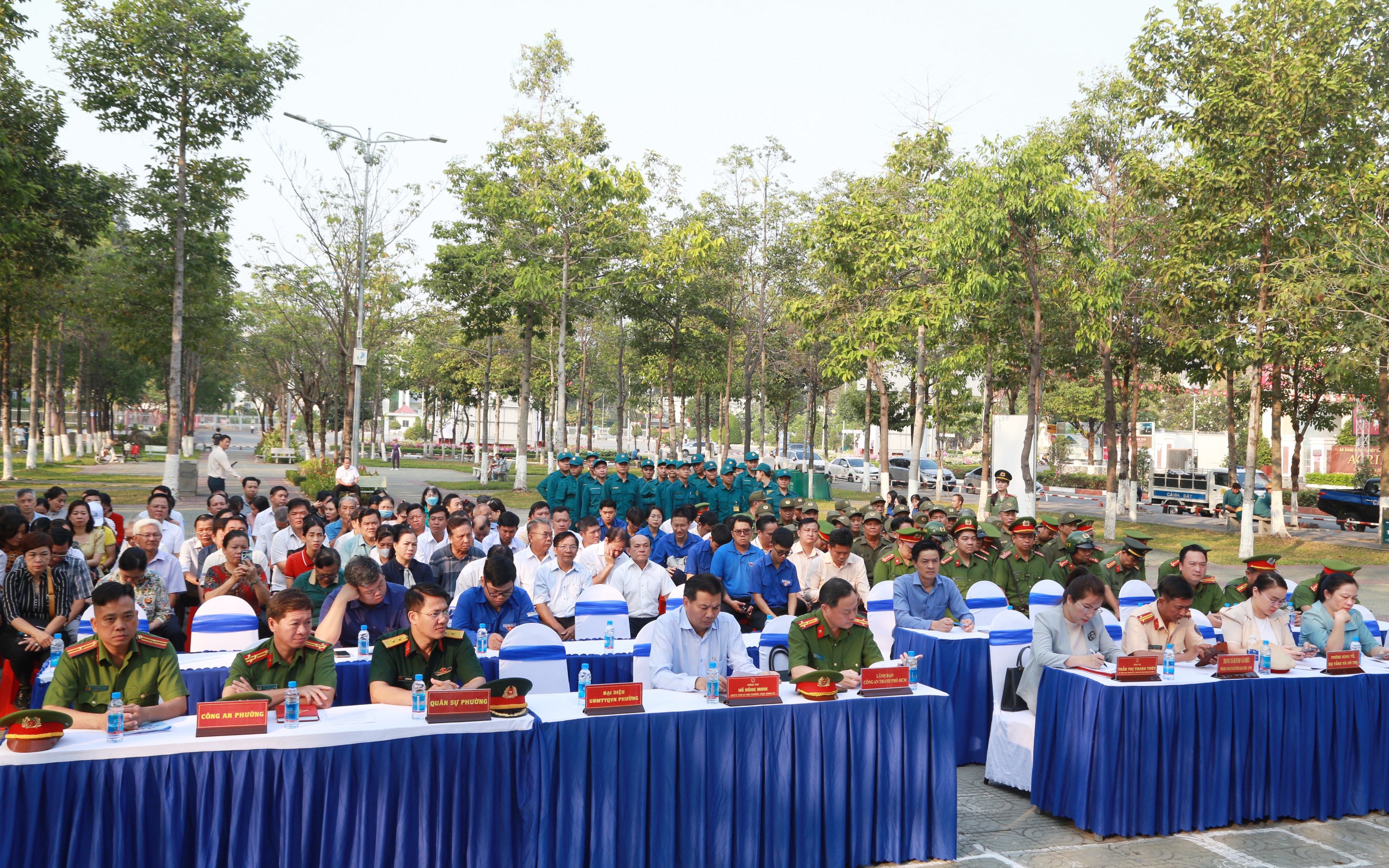 Lãnh đạo Đảng ủy, HĐND, UBND, Ủy ban MTTQ Việt Nam phường Dĩ An tặng hoa cho lực lượng thực hiện nhiệm vụ tại lễ ra quân. Ảnh: Văn Dũng