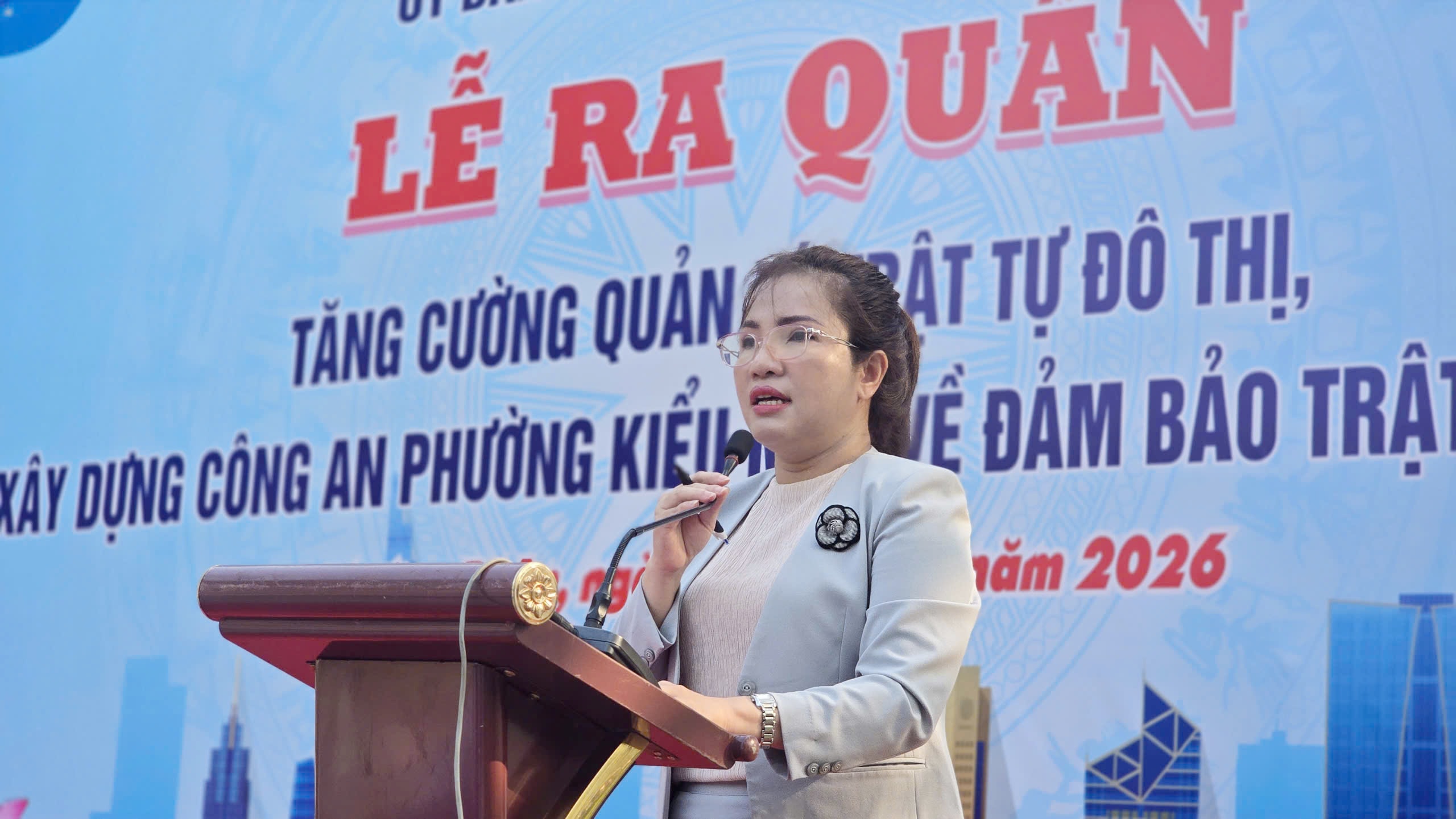 Phó Chủ tịch Thường trực UBND phường Dĩ An Trần Thị Thanh Thủy phát biểu tại lễ ra quân