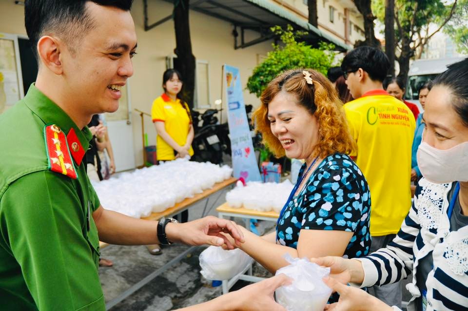 Ngày 25-1, các Chiến sĩ Xuân tình nguyện phường Tân Định, Chi đoàn Công an phường Tân Định phối hợp cùng sự đồng hành của Chiến sĩ Xuân tình nguyện Trường Đại học Quốc tế Hồng Bàng tổ chức hoạt động phát cháo, sữa tại Bệnh viện Nhi đồng 2. Ảnh: T.Định
