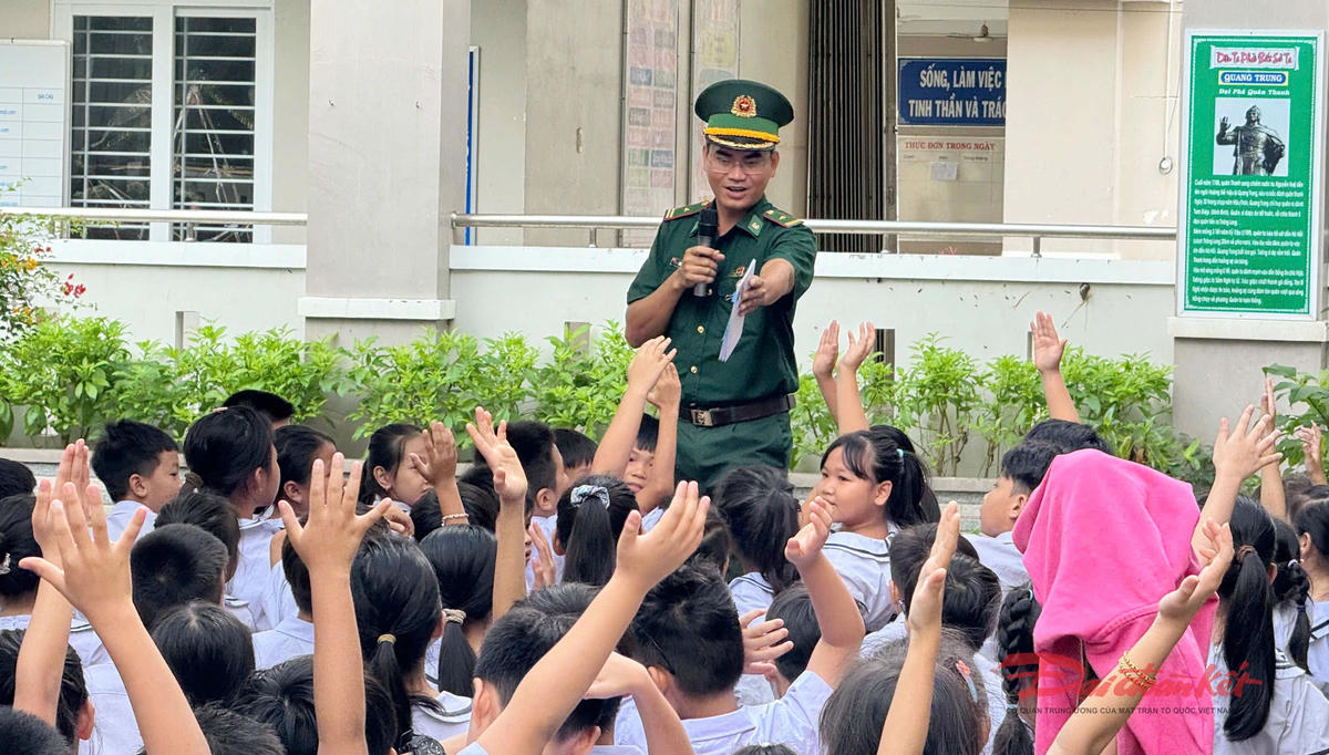 Thiếu tá Hoàng Hải Nam - Chính trị viên phó Đồn Biên phòng Phước Tỉnh giao lưu cùng các em học sinh. Ảnh: Lương Kiểm.