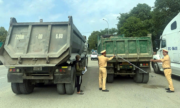 CSGT TP Hồ Chí Minh tăng cường kiểm tra, siết chặt quản lý xe tải tự đổ, tập trung xử lý các vi phạm như thiết bị giám sát hành trình, camera người lái và tình trạng cơi nới, quá tải. Ảnh: PC08