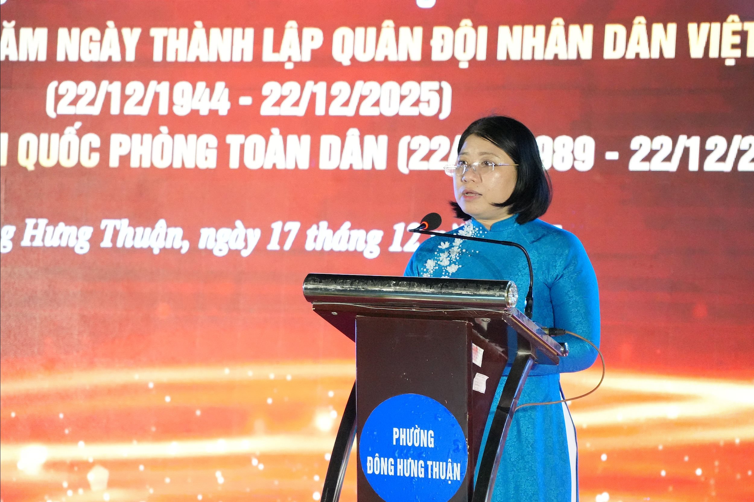Phát biểu tại buổi gặp mặt, Bí thư Đảng ủy, Chủ tịch HĐND phường Đông Hưng Thuận Thuận Trần Thị Huyền Thanh nhấn mạnh, trong không khí trang trọng, hào hùng của những ngày tháng 12 lịch sử, chương trình gặp mặt là sự kiện có ý nghĩa chính trị sâu sắc, là ngày hội lớn của những người lính và là niềm tự hào của Nhân dân phường Đông Hưng Thuận.