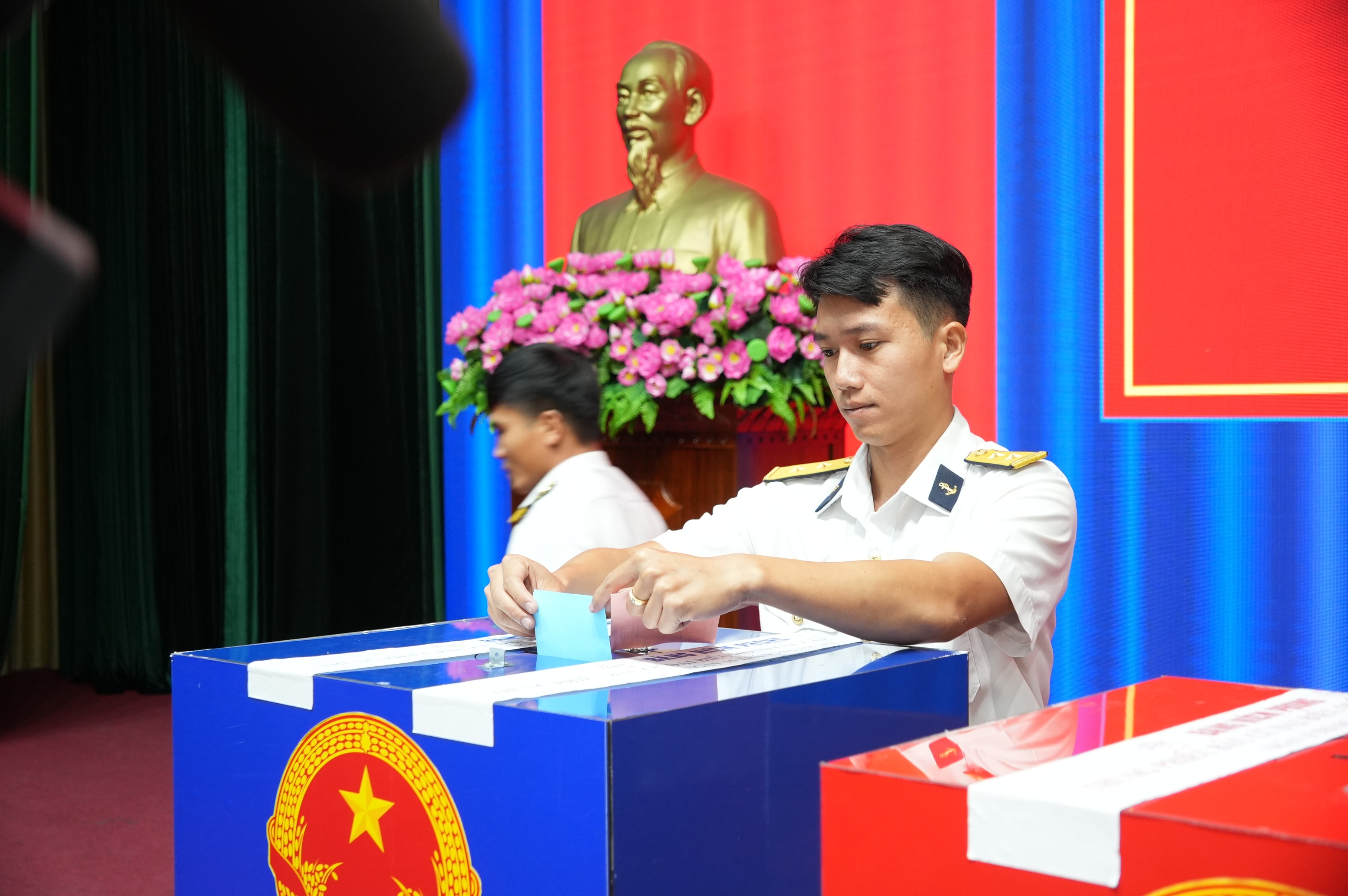 Cử tri bỏ phiếu bầu cử sớm tại điểm bầu cử Bộ Tư lệnh Vùng 2 Hải quân. Ảnh: Thạc Hiếu