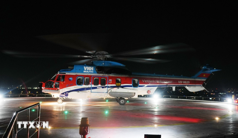 Trực thăng cấp cứu của Binh đoàn 18 (Bộ Quốc phòng) vừa phối hợp với Tổ cấp cứu đường không - Bệnh viện Quân y 175 (Bộ Quốc phòng) thực hiện chuyến bay cấp cứu đưa cùng lúc 2 trường hợp từ đặc khu Trường Sa (tỉnh Khánh Hòa) về đất liền an toàn.