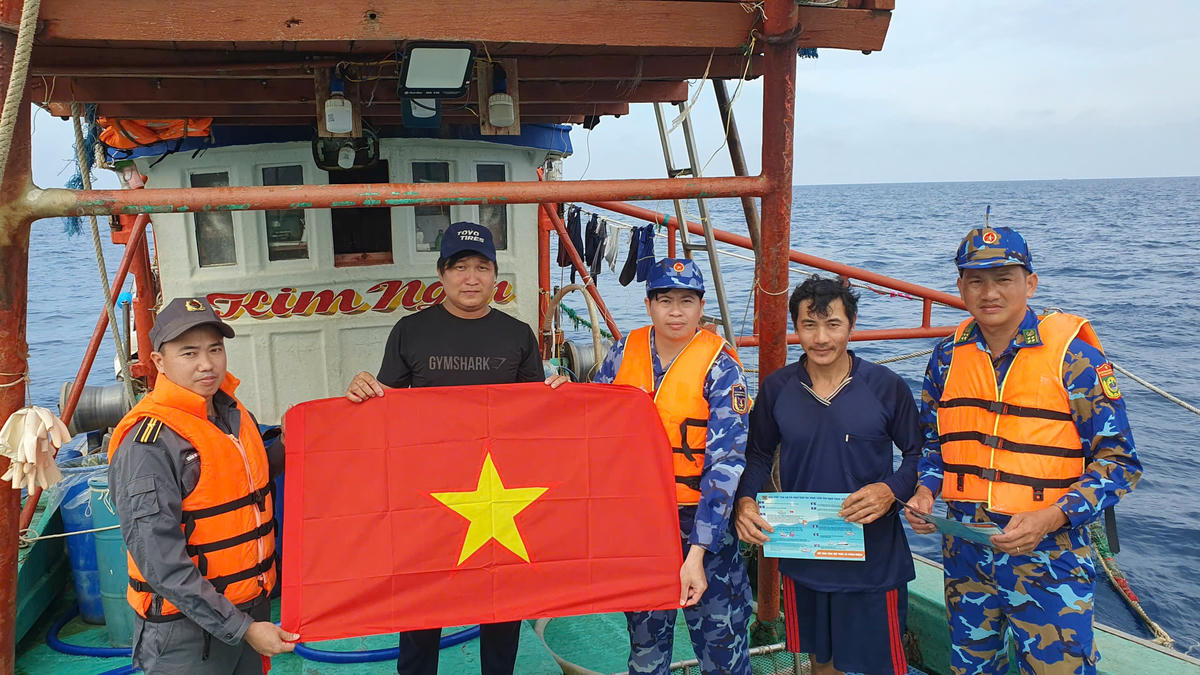 Lực lượng Kiểm ngư tuyên truyền pháp luật tới ngư dân trên biển. Ảnh: Ngọc Chung.