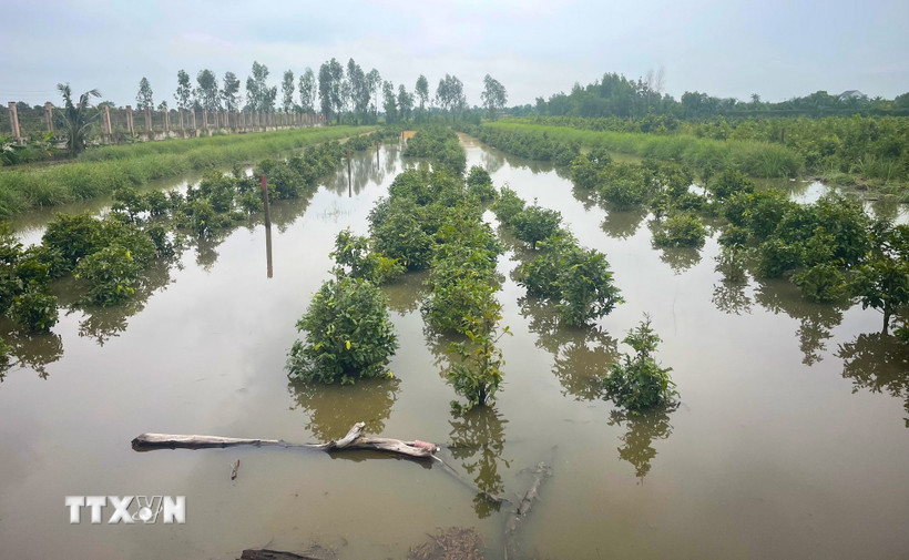 Vườn mai tại xã Bình Lợi (Thành phố Hồ Chí Minh) bị ngập trong nước. (Ảnh: Hương Giang/TTXVN)
