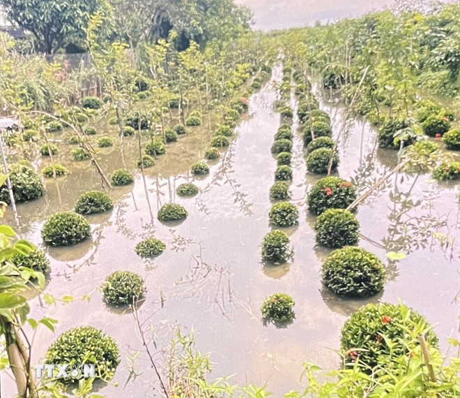 Theo ghi nhận của phóng viên TTXVN, trong những ngày qua, triều cường kết hợp mưa lớn đã gây ngập nhiều diện tích sản xuất hoa kiểng gần các bờ bao, kênh mương trên địa bàn phường Sa Đéc, tỉnh Đồng Tháp.