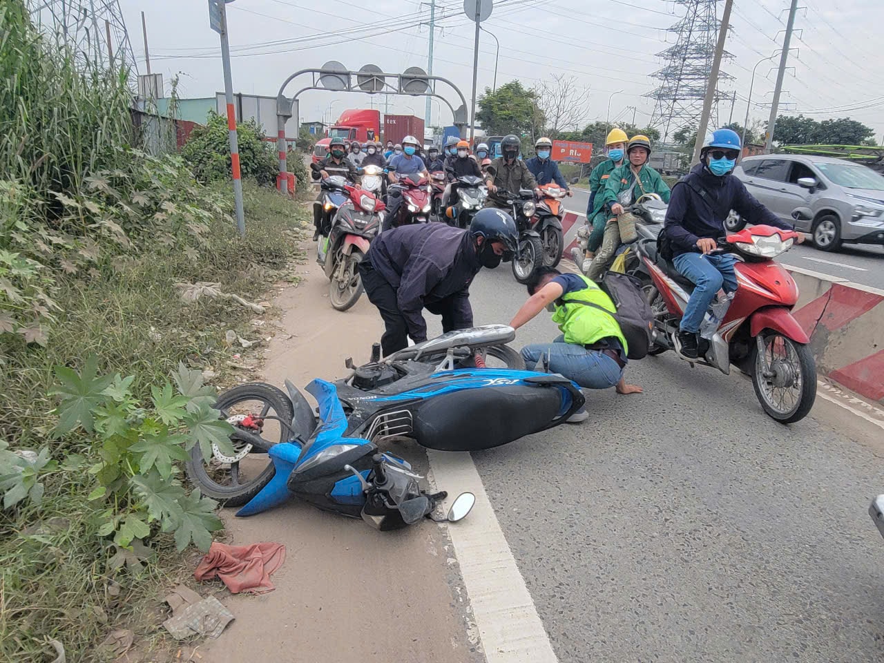 Xe máy va quẹt vả xảy ra tai nạn giao thông tại làn đường xe gắn máy trên đường Võ Chí Công. Người đi đường giúp người bị nạn. Ảnh: Quang Phương
