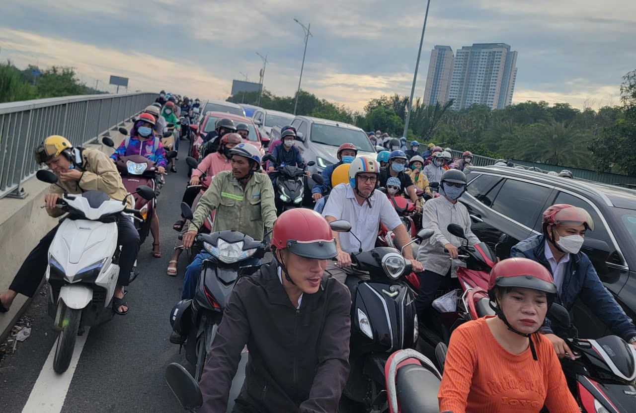 Tình trạng ùn tắc giao thông cục bộ tại tuyến đường song hành cao tốc TP. Hồ Chí Minh - Long Thành (đoạn nút giao An Phú). Ảnh: Quang Phương