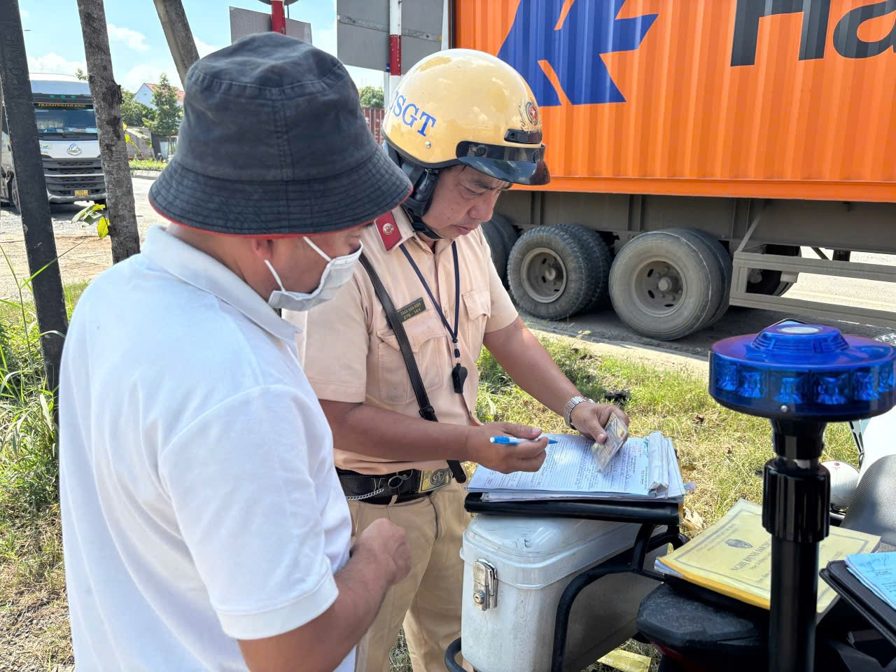 Cán bộ Đội Cảnh sát giao thông Rạch Chiếc ra quân xử lý nhiều trường hợp xe tải đầu kéo vi phạm trên tuyến Mỹ Phước - Tân Vạn. Ảnh: Nghiêm Ý