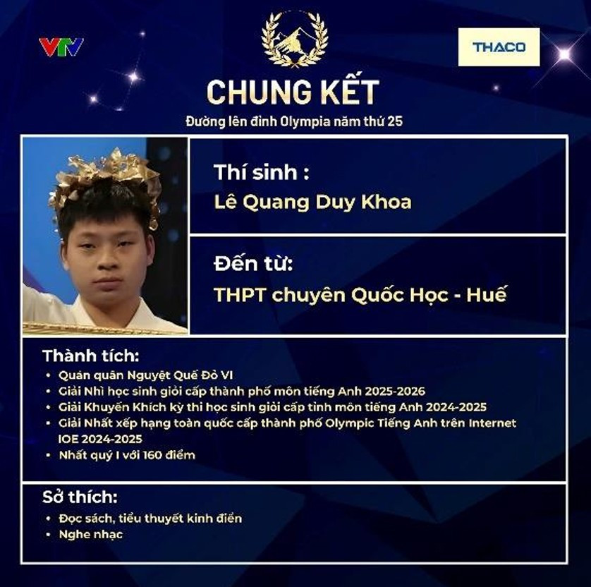 Ban Tổ chức mong nhận được sự thông cảm và phối hợp đồng hành của các đơn vị, khán giả - những người yêu quý học sinh Huế, em Lê Quang Duy Khoa, học sinh Trường THPT chuyên Quốc Học – Huế và giáo dục Huế, để chương trình diễn ra an toàn, thành công, góp phần vào thành công chung của Chương trình chung kết Đường lên đỉnh Olympia lần 25 năm 2025 của Đài Truyền hình Việt Nam; tiếp tục lan tỏa tinh thần ham học, học giỏi, khát vọng và lòng tự hào truyền thống chinh phục đỉnh cao tri thức của học sinh Huế.