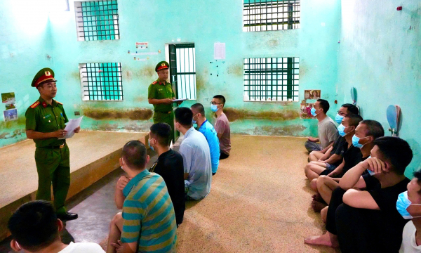 Cán bộ quản giáo phổ biến các quy định về bầu cử cho người bị tạm giữ, tạm giam tại Trại tạm giam Công an TP Huế.