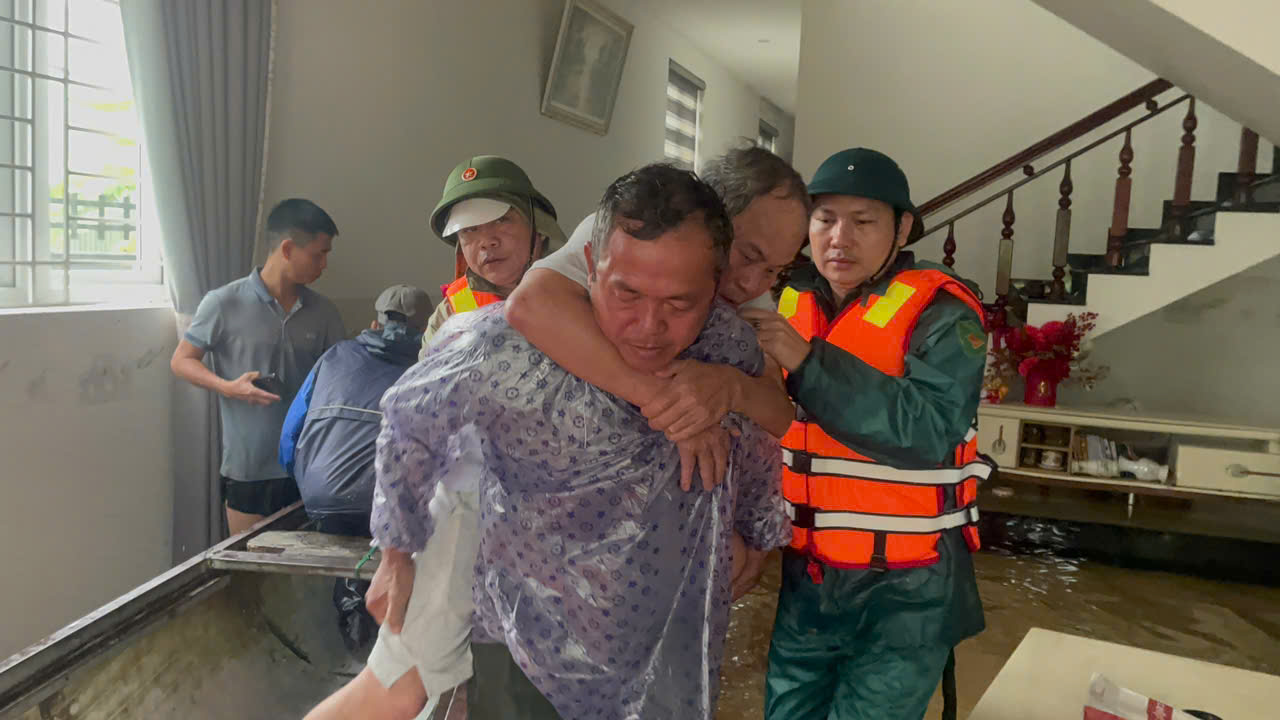 >>> Video: Thiếu tá Nguyễn Tấn Phước, Trưởng Công an phường An Cựu, TP Huế động viên người phụ nữ bị huyết áp, chảy máu mũi khi đang trên đường vượt lũ đi cấp cứu.