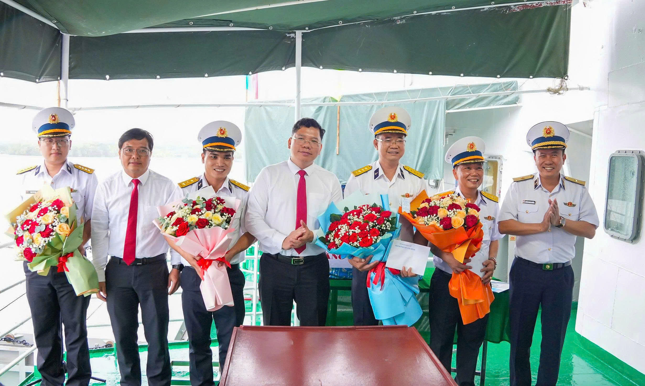 Phó Chủ tịch UBND TPHCM Hoàng Nguyên Dinh tặng hoa các thành viên của 2 tàu công tác Trường Sa 04 và tàu Trường Sa 21 lên đường thực hiện nhiệm vụ đưa thùng phiếu ra các Nhà giàn DK1 và các tàu trực trên biển