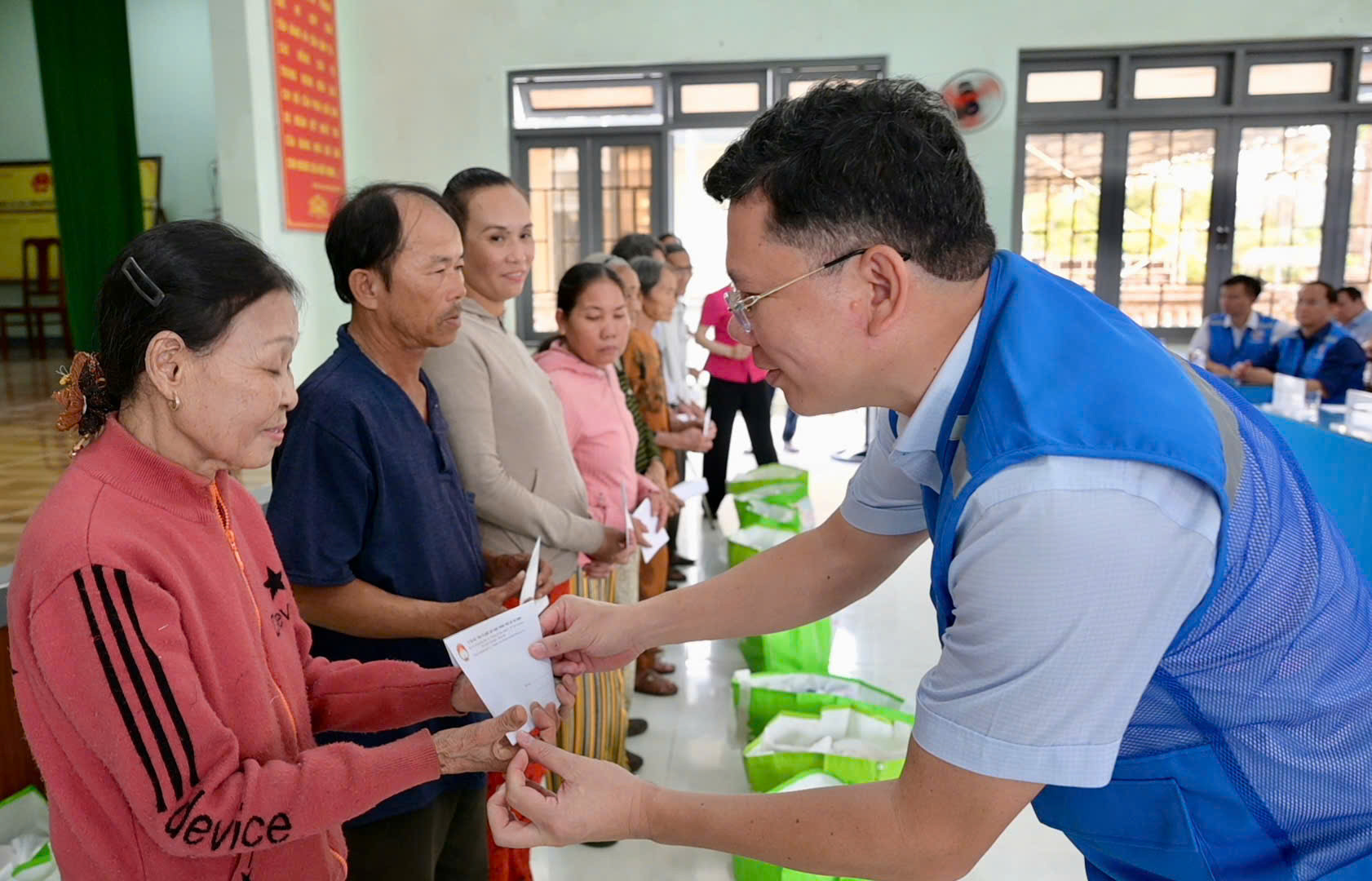 Thành viên Đoàn công tác do Chủ tịch UB MTTQ VN TPHCM Nguyễn Phước Lộc dẫn đầu đang thăm hỏi, động viên và hỗ trợ người dân tỉnh Quảng Ngãi ngày 12/11. Ảnh: M.T.