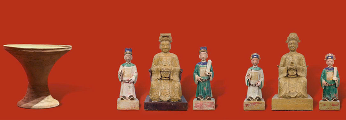 Cạnh đó là Bộ tượng gốm men nhiều màu Tam quan Đại đế (niên đại cuối thế kỷ XIX – đầu thế kỷ XX), thuộc sưu tập tư nhân của ông Lê Thanh Nghĩa cũng được công nhận Bảo vật quốc gia trong đợt này.