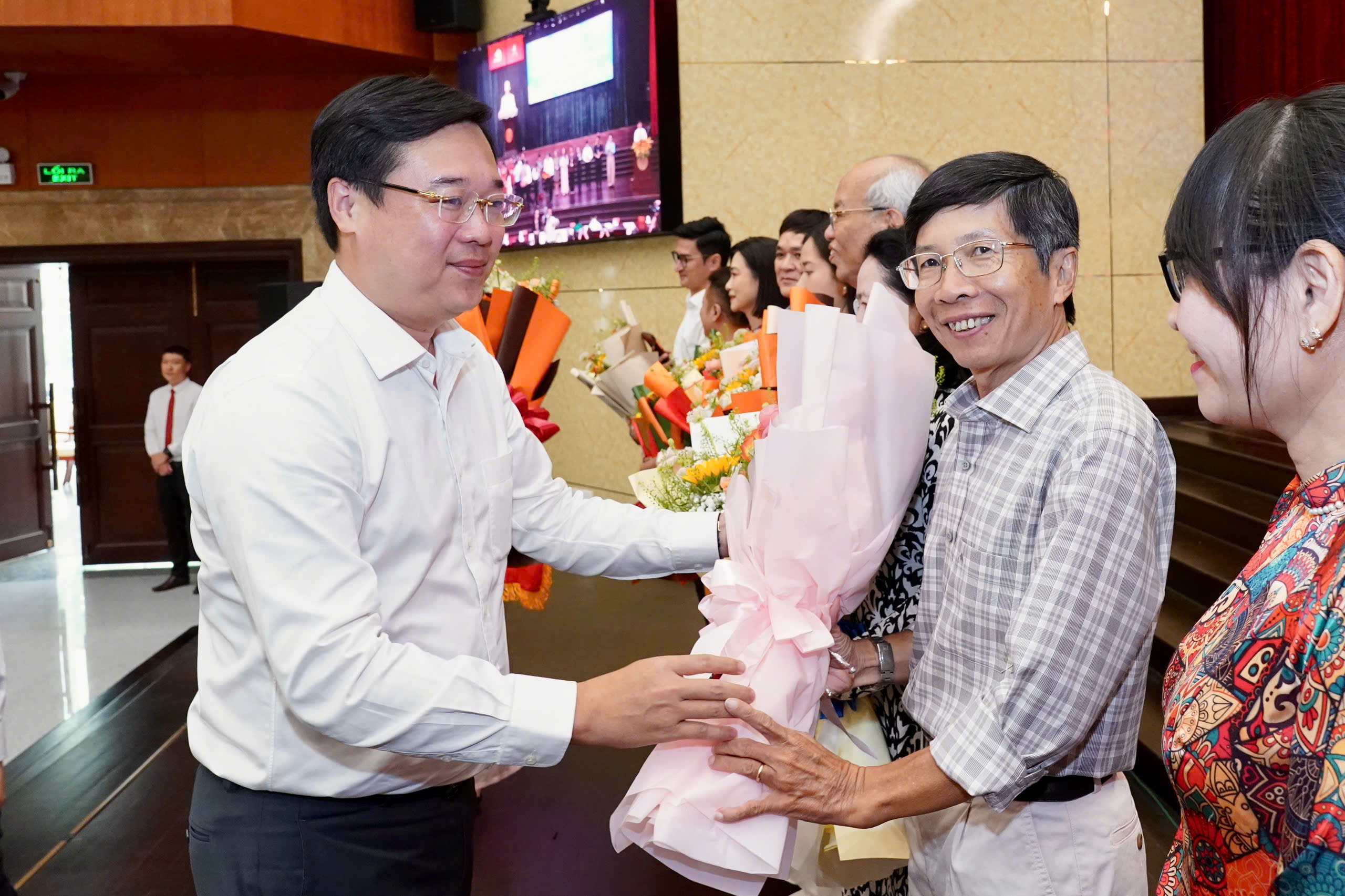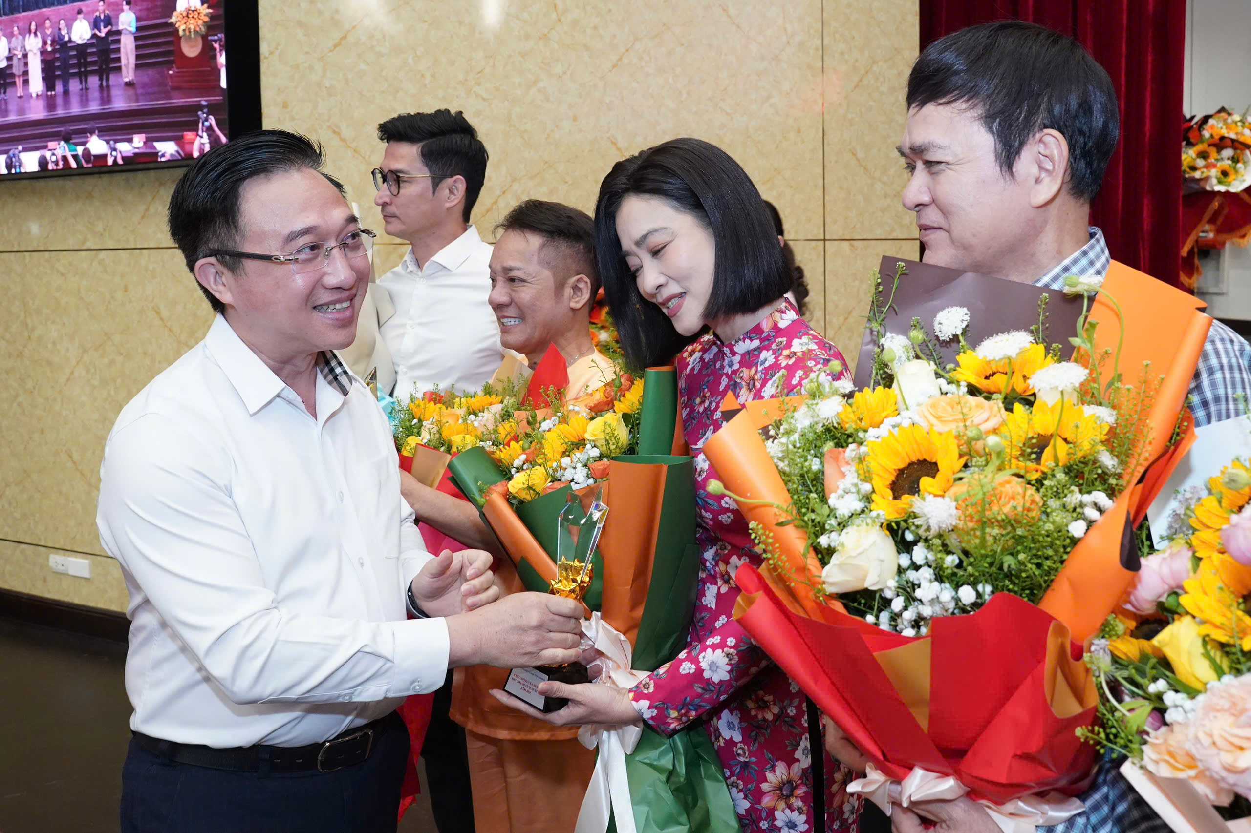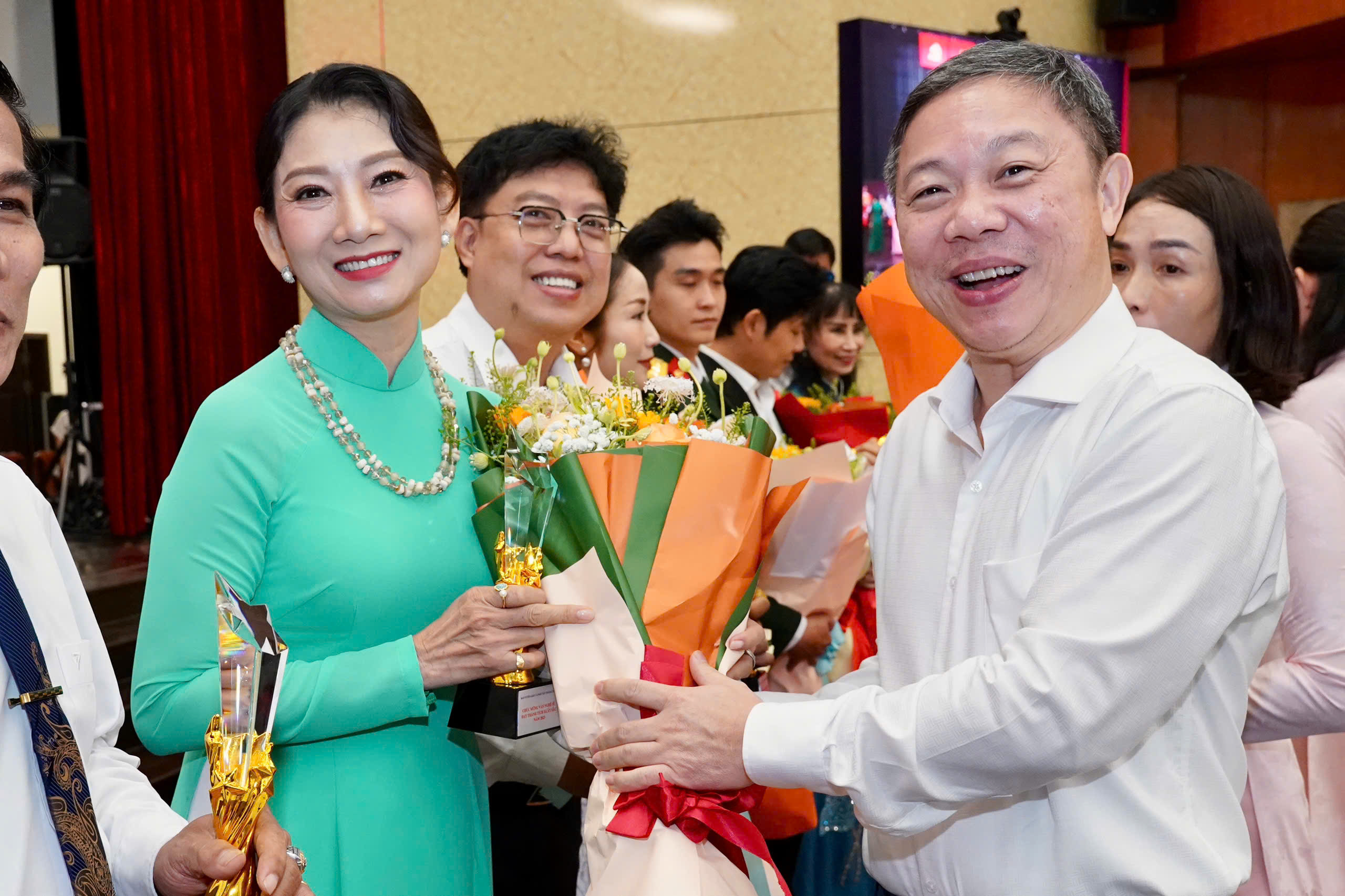 Phó Bí thư Thành ủy TPHCM Đặng Minh Thông tặng hoa các văn nghệ sĩ. Ảnh: HOÀNG HÙNG