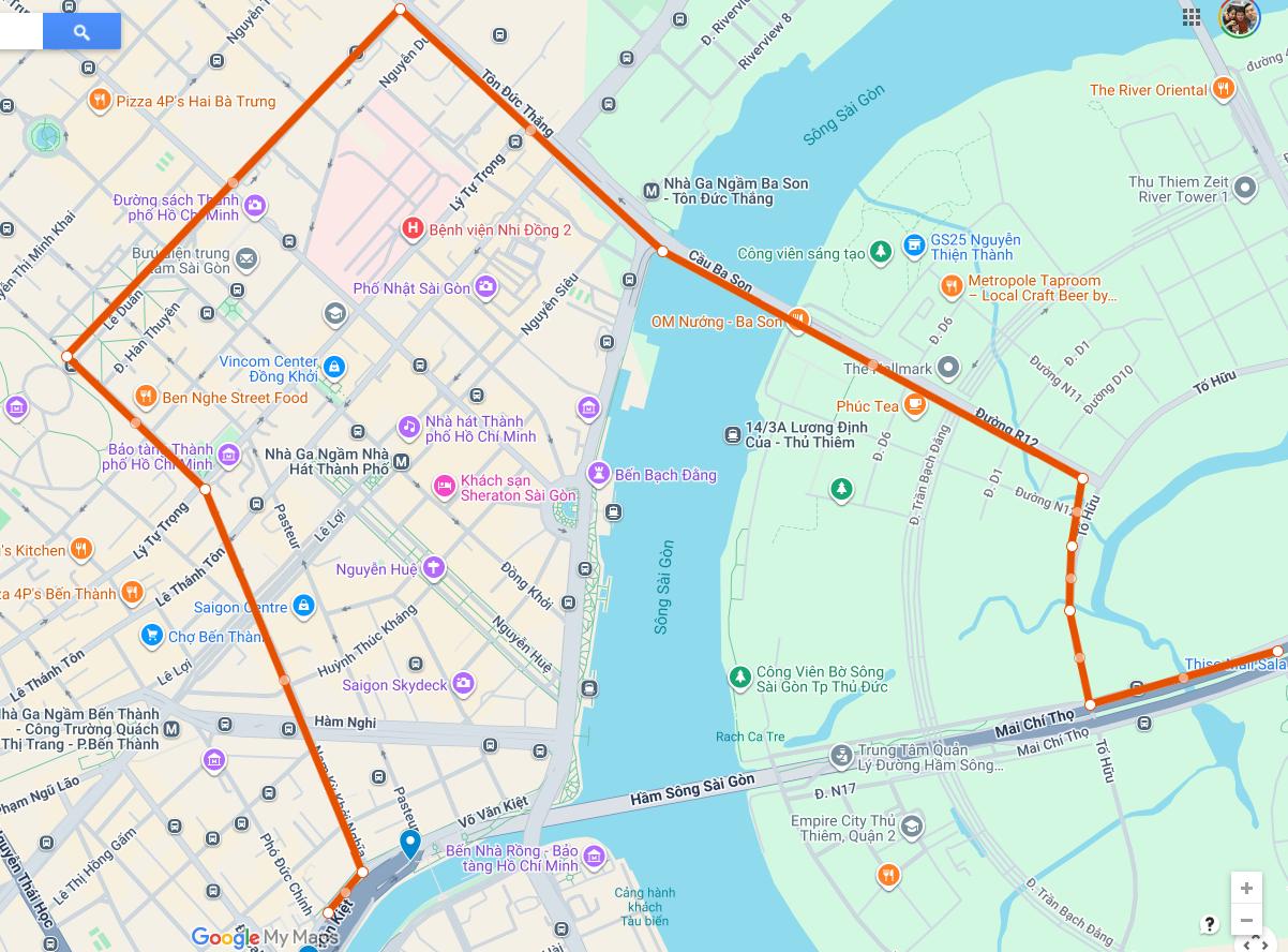 Hướng từ trung tâm TPHCM về khu đô thị mới Thủ Thiêm: Đường Võ Văn Kiệt – đường song hành Võ Văn Kiệt – đường Võ Văn Kiệt – đường Tôn Đức Thắng – Cầu Ba Son – đường R12 – đường Tố Hữu – đường Mai Chí Thọ.